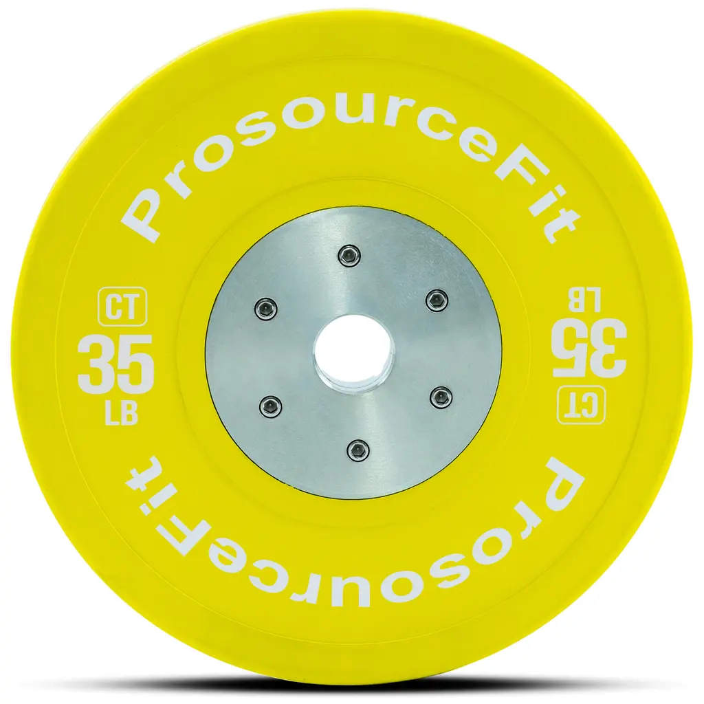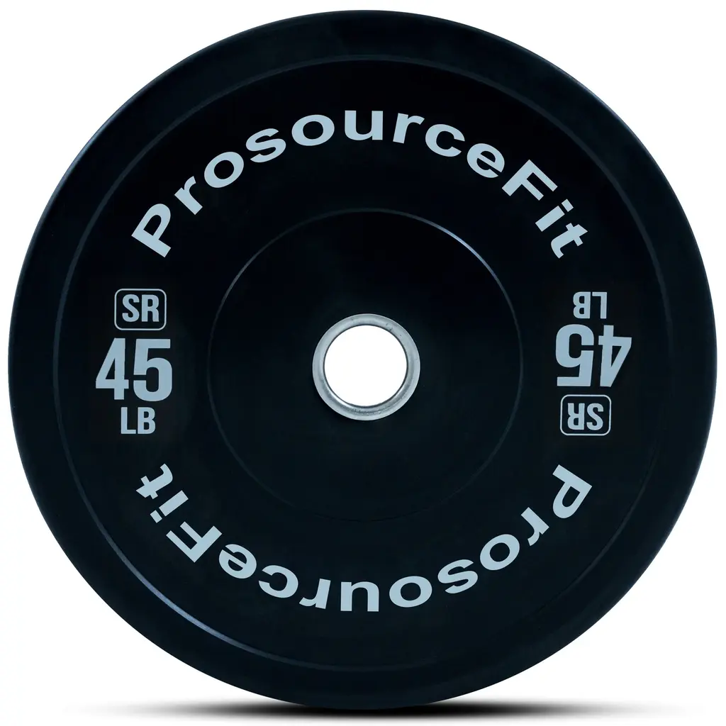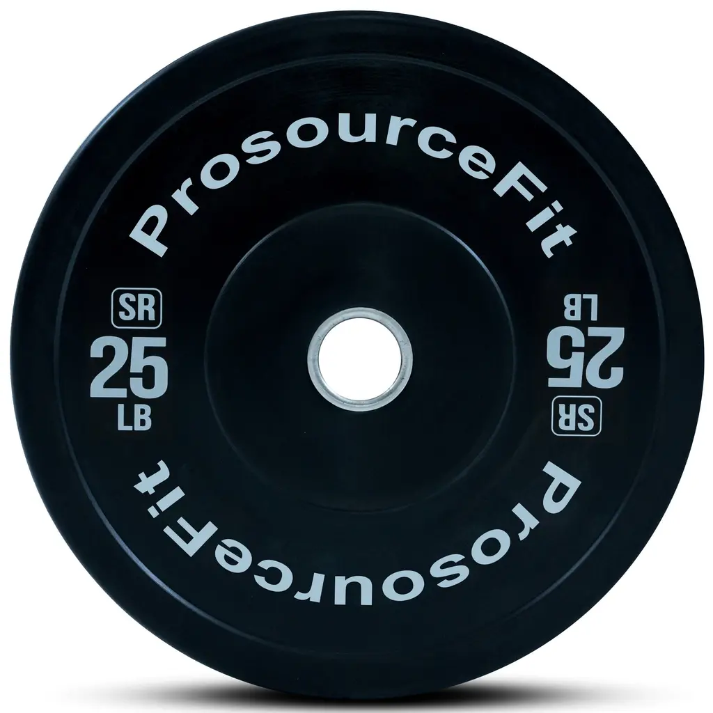 ProsourceFit Bumper Plates are built with the highest quality for use in cross-training or commercial gyms but are also perfect for garage gyms and home use. These plates offer low bounce with a durometer of 88 (+/-5), so they won't fly around the floor when you drop them. The solid rubber design can withstand repeated drops and won't damage your floors like other plates. The narrow width of each plate allows you to fit more weight on your barbell. (Durometer measurements indicate the density of the rubber and how much a plate bounces when dropped, with 100 being hard with no bounce, and 65 being softer with a lot of bounce.) CT - series The color training bumper plates have IWF competition-standard colors and markings. Plates are also calibrated to competition standards for the most accurate weights. Each plate has a diameter of 450mm and width varies from 30-72mm depending on weight. Plates have zinc steel inserts and fit barbells with two-inch sleeves. SR - series The solid rubber bumper plates have a diameter of 450mm and the width varies from 30-60mm depending on weight. Solid rubber bumper plates have stainless steel inserts and fit on 2-inch barbell sleeves.