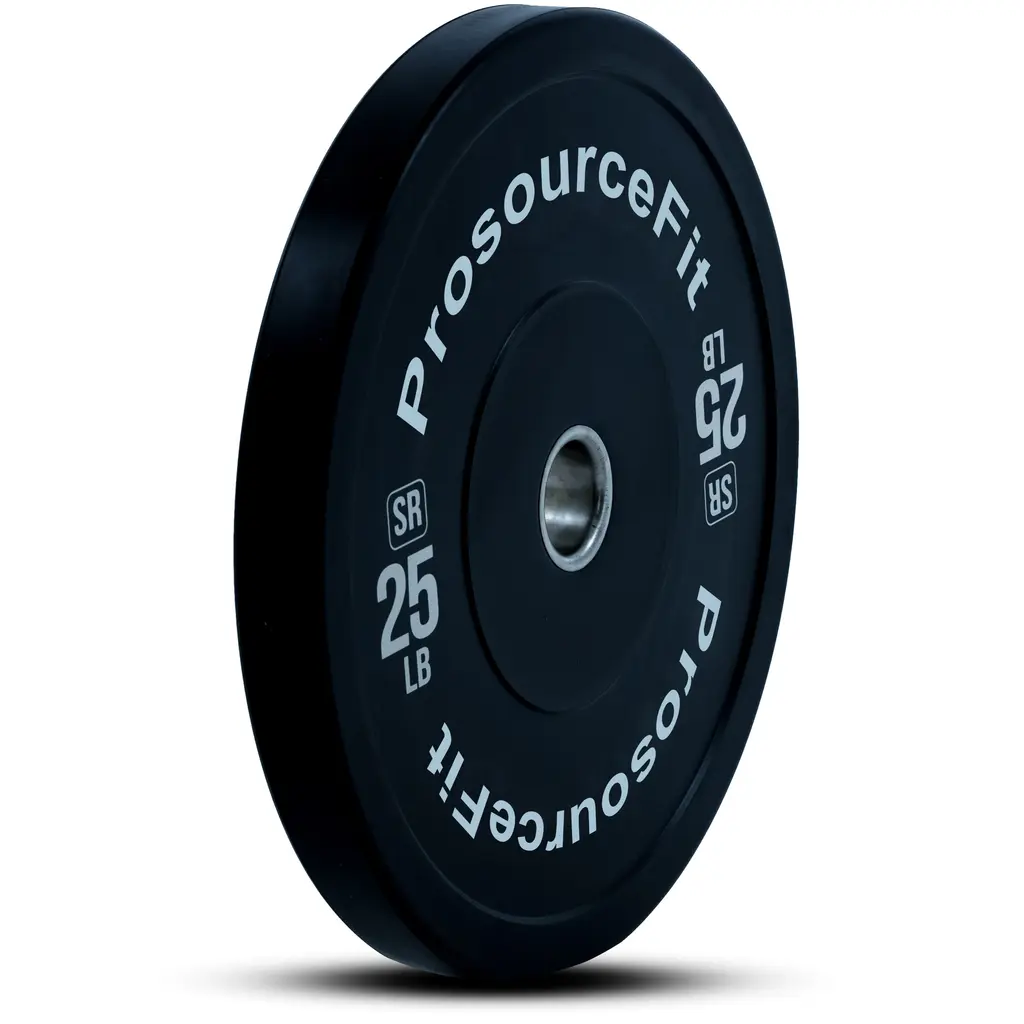 ProsourceFit Bumper Plates are built with the highest quality for use in cross-training or commercial gyms but are also perfect for garage gyms and home use. These plates offer low bounce with a durometer of 88 (+/-5), so they won't fly around the floor when you drop them. The solid rubber design can withstand repeated drops and won't damage your floors like other plates. The narrow width of each plate allows you to fit more weight on your barbell. (Durometer measurements indicate the density of the rubber and how much a plate bounces when dropped, with 100 being hard with no bounce, and 65 being softer with a lot of bounce.) CT - series The color training bumper plates have IWF competition-standard colors and markings. Plates are also calibrated to competition standards for the most accurate weights. Each plate has a diameter of 450mm and width varies from 30-72mm depending on weight. Plates have zinc steel inserts and fit barbells with two-inch sleeves. SR - series The solid rubber bumper plates have a diameter of 450mm and the width varies from 30-60mm depending on weight. Solid rubber bumper plates have stainless steel inserts and fit on 2-inch barbell sleeves.