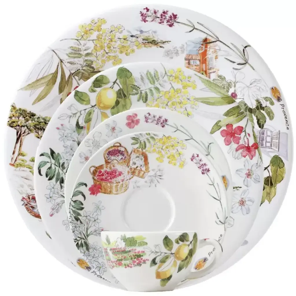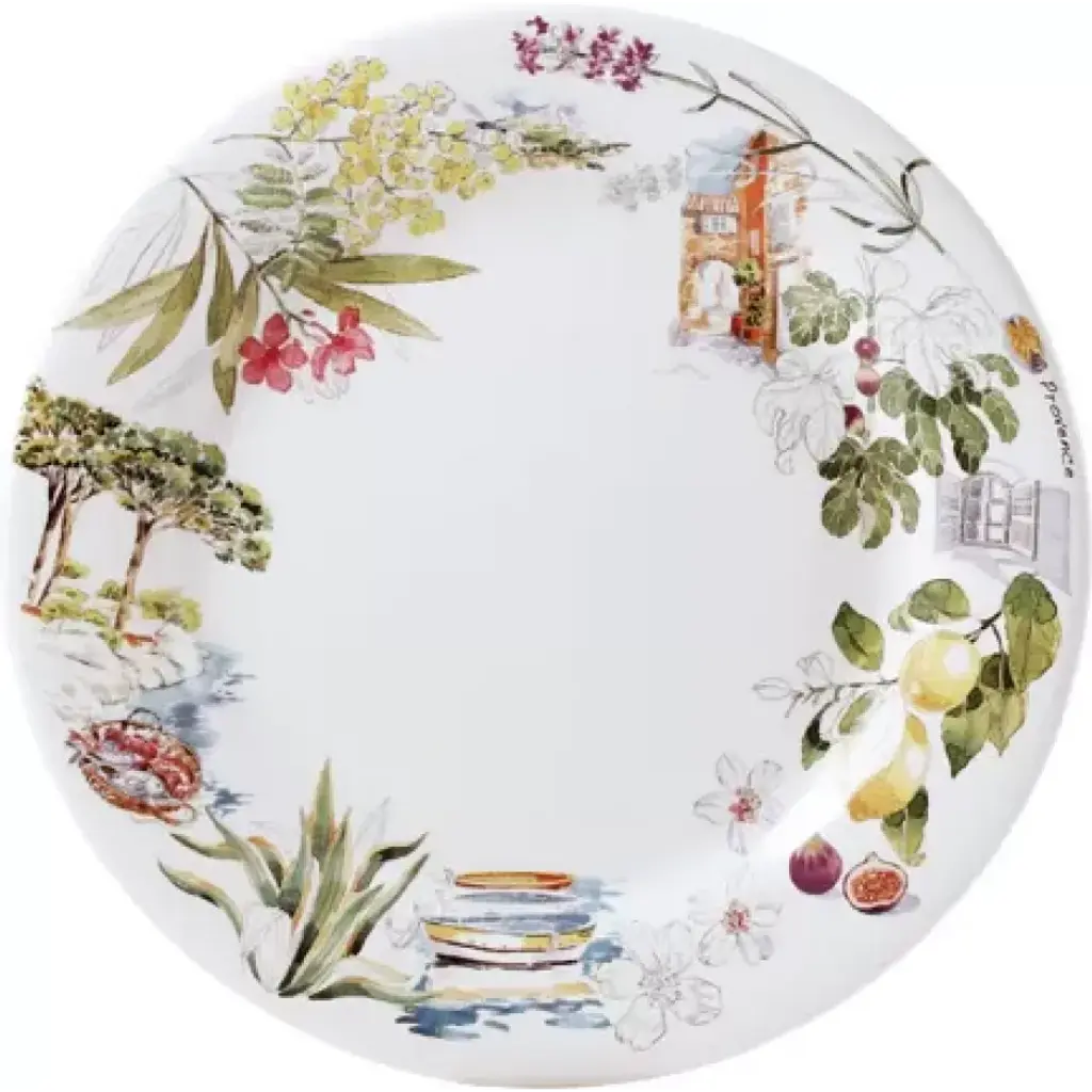 Gien's colorful Provence dinnerware immerses you into a market atmosphere full of lavender and lemon scents. For designer Isabelle Barthel, wach watercolor pencil drawing evokes a distinct memory about Provence, including the fruit, the flowers, the sea, and the sky. Faience earthenware made in France by Gien. Four-piece place setting includes dinner plate, dessert plate, bowl, and mug. Five-piece place setting includes dinner plate, dessert plate, canape plate, US tea cup, and saucer. Located near the Loire Valley castles, the Faïencerie de Gien has been synonymous with prestigious faience tableware and decorative objects since its founding in 1821. Gien pieces are renowned for their warm white clays decorated with traditional motifs reminiscent of the French countryside.