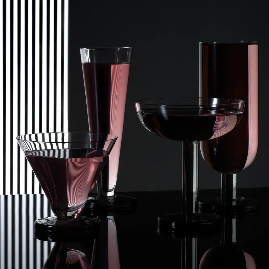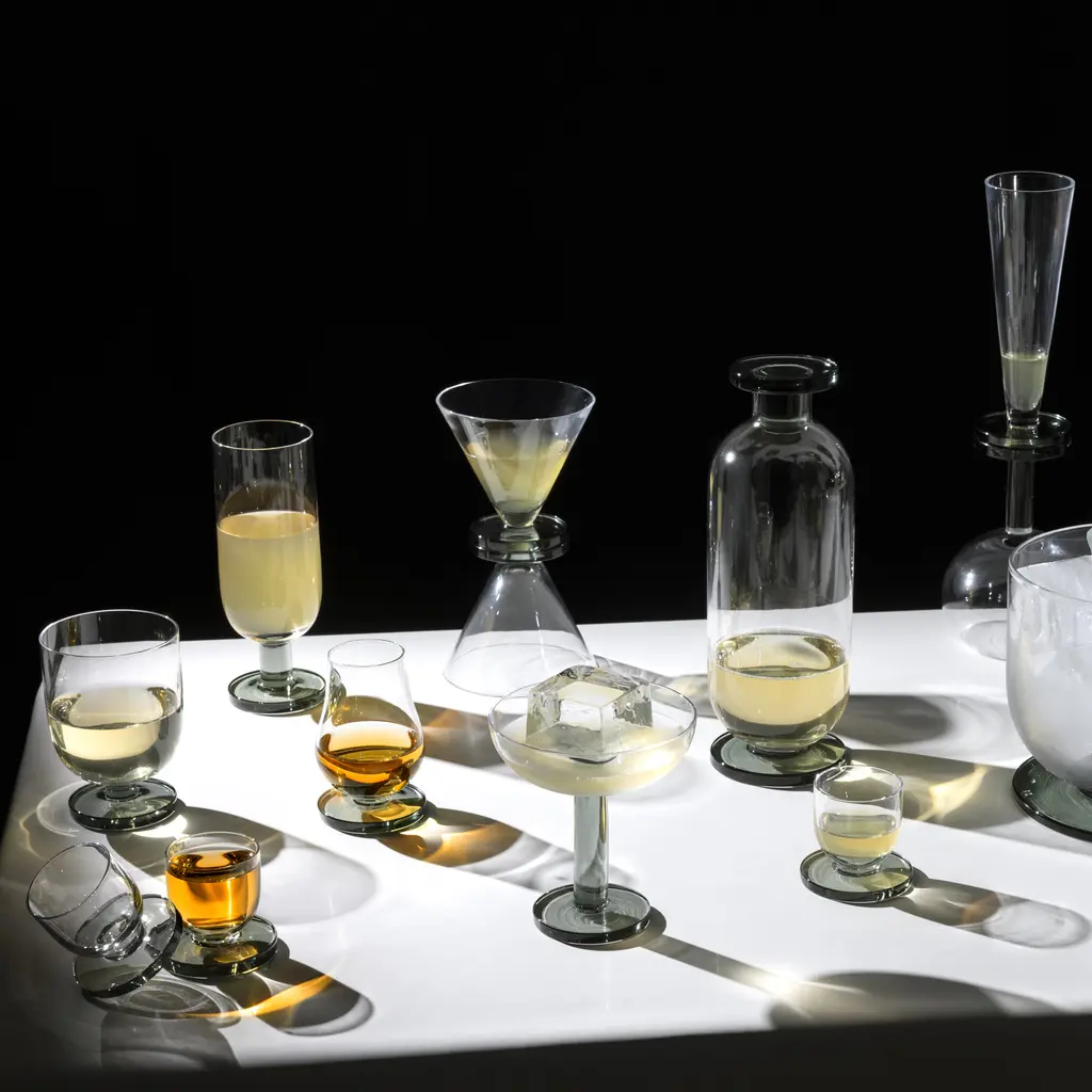 This pair of Tom Dixon highball glasses are made of mouth-blown glass with a hint of smoke colour. Anchored with a thick base which is reminiscent of game pucks, minimal and heavy-weight, Puck glasses are resilient enough to survive in a professional cocktail environment. Using the basic forms of geometry, such as cylinders, cones and spheres. Puck is available in a series of glassware including Water, Nosing, Champagne, Coupe, Balloon, Cocktail, Highball, and Shot Glasses as well as a Decanter and Ice Bucket.