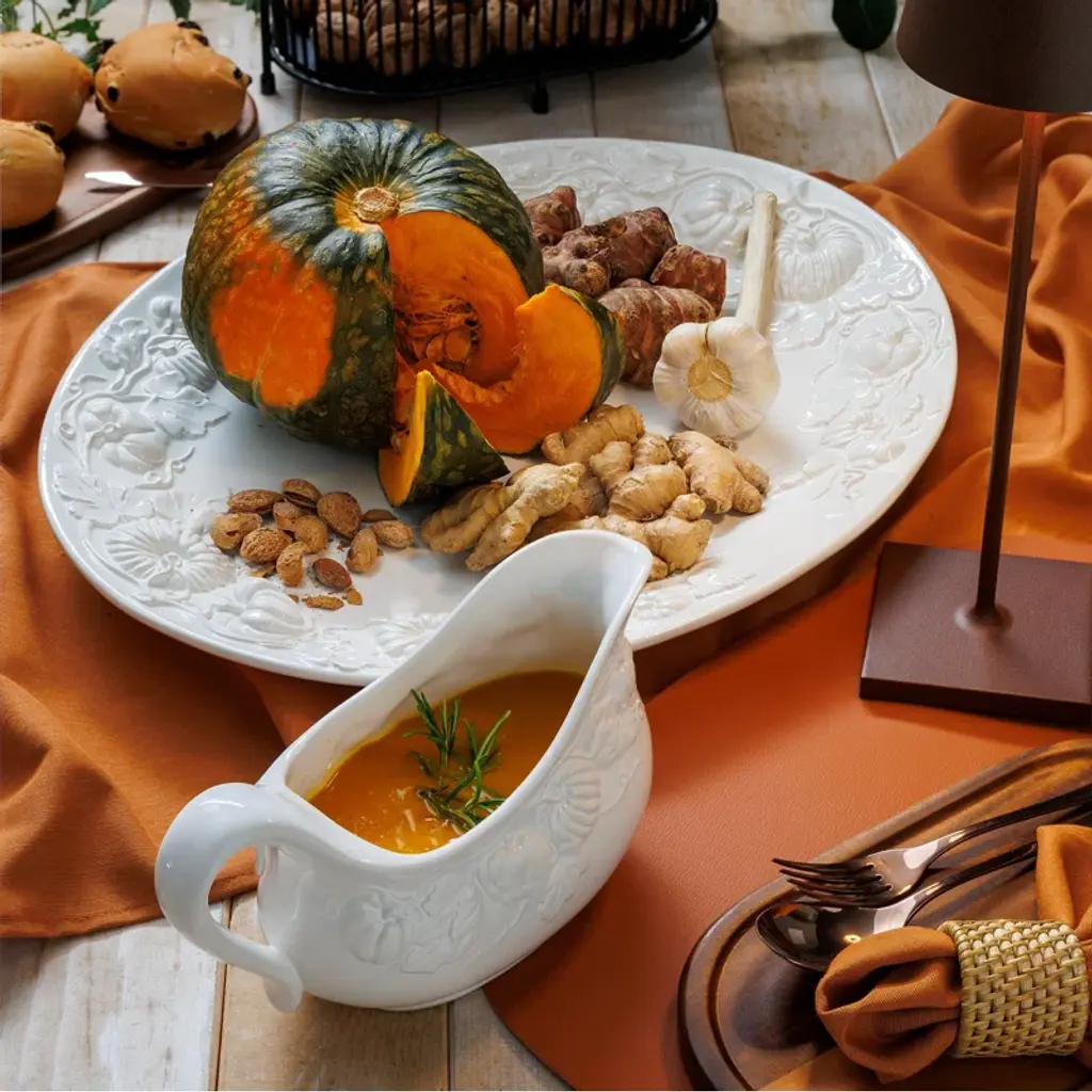Enjoy the crispness of autumn with the Pumpkin Leaf collection by Euro Ceramica. To celebrate the season of abundance during this fall’s harvest, the Pumpkin Leaf collection includes plenty of extra large pieces perfect for you and your loved ones to indulge in. The white embossed pumpkin pattern is a visual masterpiece. From the hands of artisans in Italy, one honorable family has passed down the tradition of crafting these embossed ceramics from generation to generation. With Pumpkin Leaf by Euro Ceramica, you can carry the cozy and inviting feeling of the autumn season straight to your home.