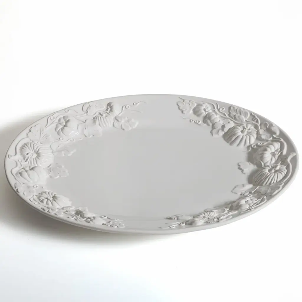 Pumpkin Leaf Turkey Platter And Gravy Boat Set, White Embossed Pumpkin Fall Harvest, Made In Italy