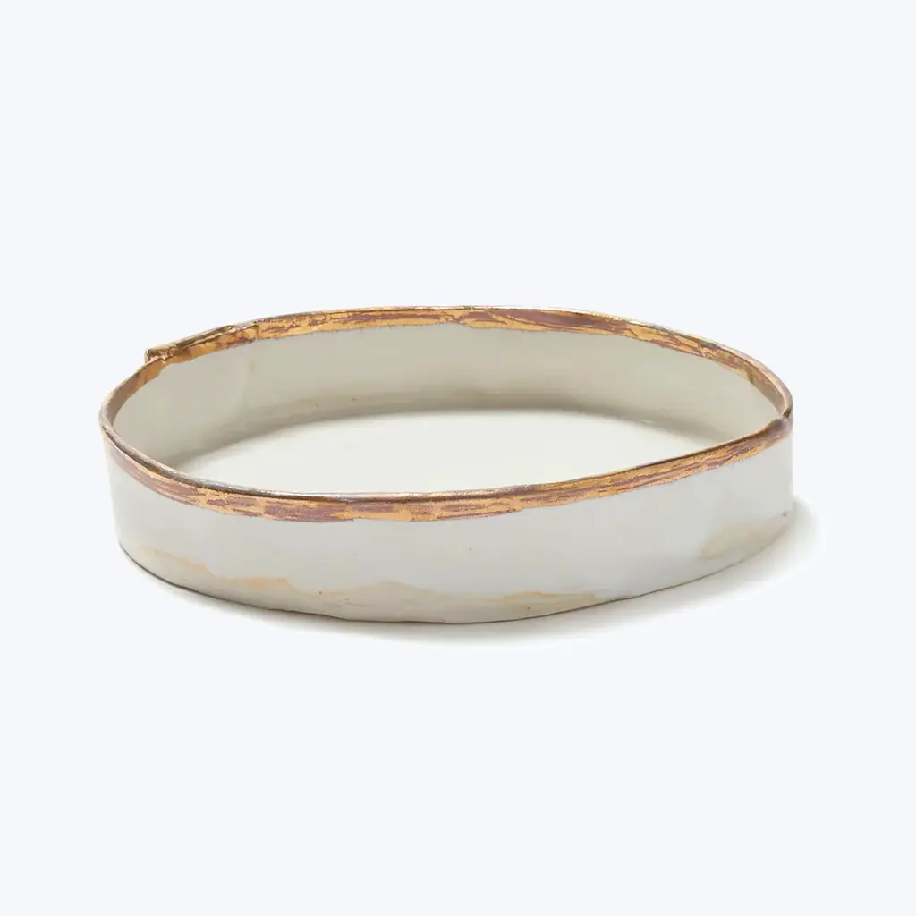 Exclusively at abc, this Jan Burtz creation is touched by a delicate gold border that lovingly outlines its natural and irregular forms. Made by hand from creamy porcelain and homemade glazes, these pieces bring us back to the basics, accentuating the fluidity and grace of hand-formed wares. Made in Jan Burtz's Connecticut studio, no two pieces are alike, though all are food, dishwasher, and microwave safe.