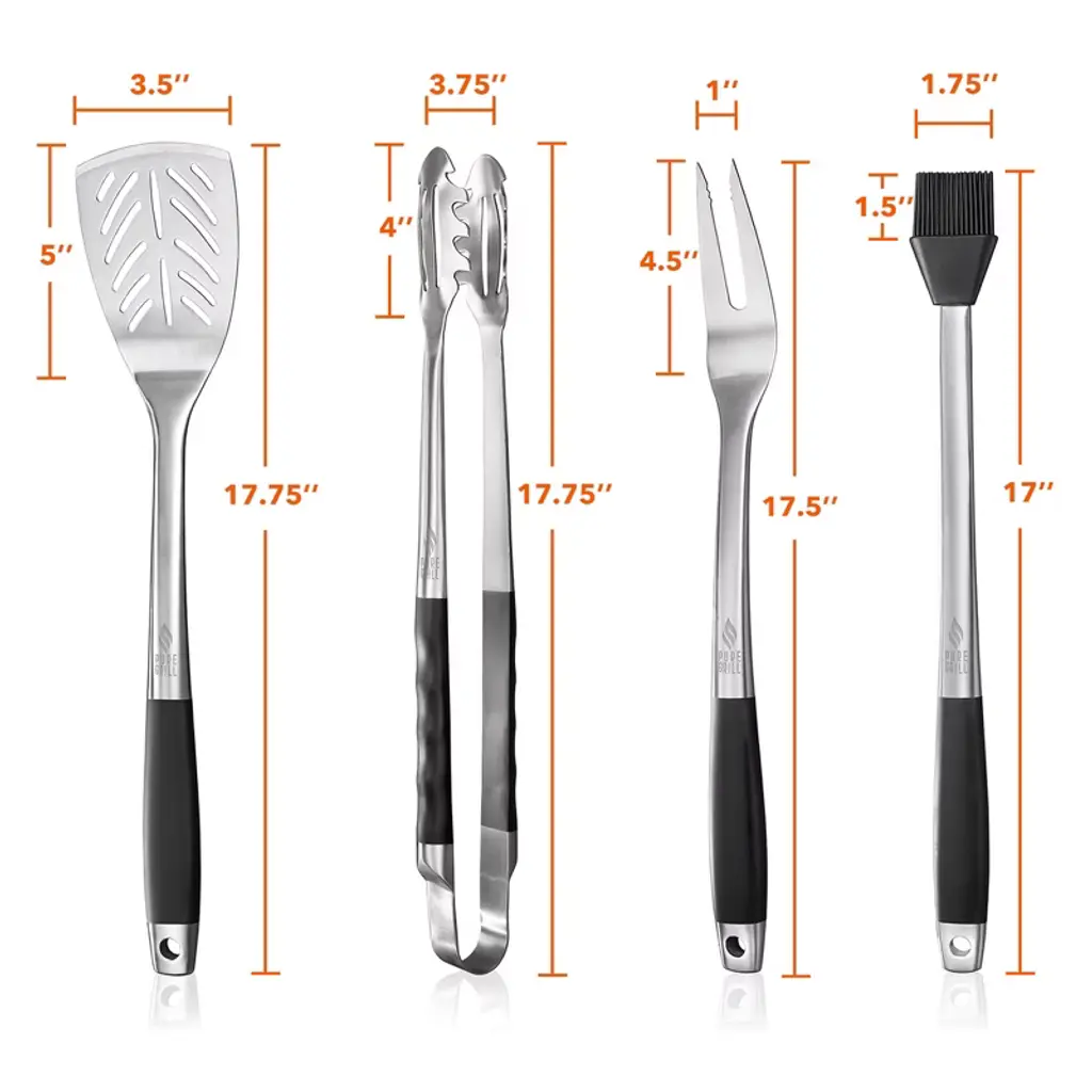 Pure Grill’s professional 4-piece BBQ tool set is a grill master’s dream. Set includes a barbecue spatula, meat fork, tongs, and basting brush. This BBQ tool set is constructed of solid 430 food-grade stainless steel. Designed to resist rust and warping, these grilling tools are built to last. Expert craftsmanship and the highest quality materials were used to create this top-of-the-line BBQ tool utensil set. Each handle of this heavy-duty grilling set has been upgraded with an extra layer of the BPA-free, non-slip, rubberized coating for superior comfort while flipping, skewering, rotating, and basting your grilled masterpieces. Shop the entire collection of Pure Grill BBQ covers and grilling accessories.