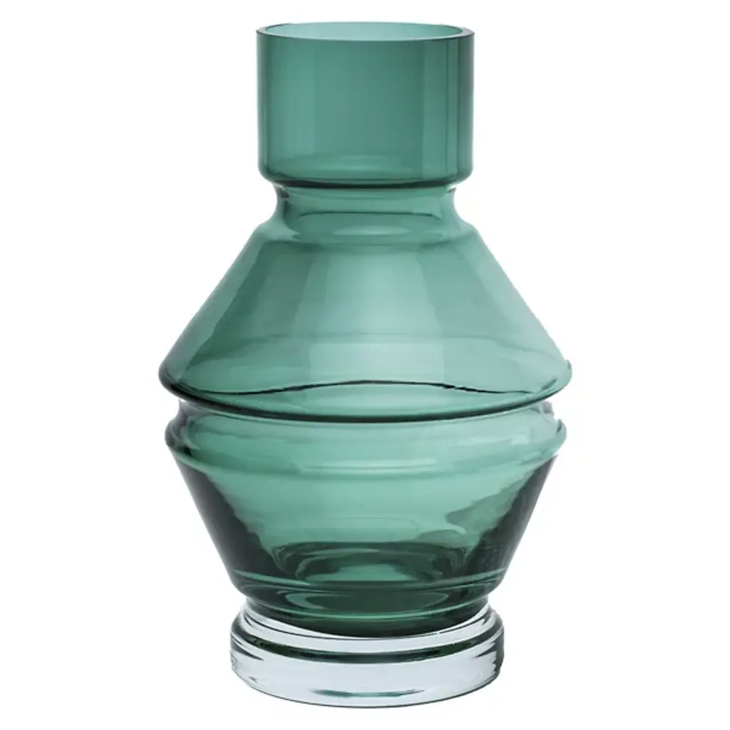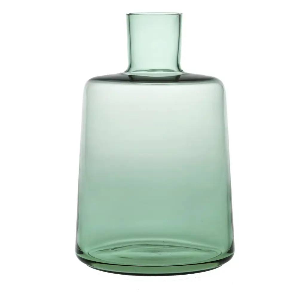 This elegant tall bottle was crafted entirely by hand of glass using traditional methods. Its elongated silhouette is finished with smooth surface, tinted at the bottom and mouth with a delicate blue color that fades toward the center, adding an ethereal touch to the piece. Either as a water bottle or a vase, to serve chilled drinks on a terrace or to decorate a mantelpiece with other bottles of different colors, this is an eye-catching object.