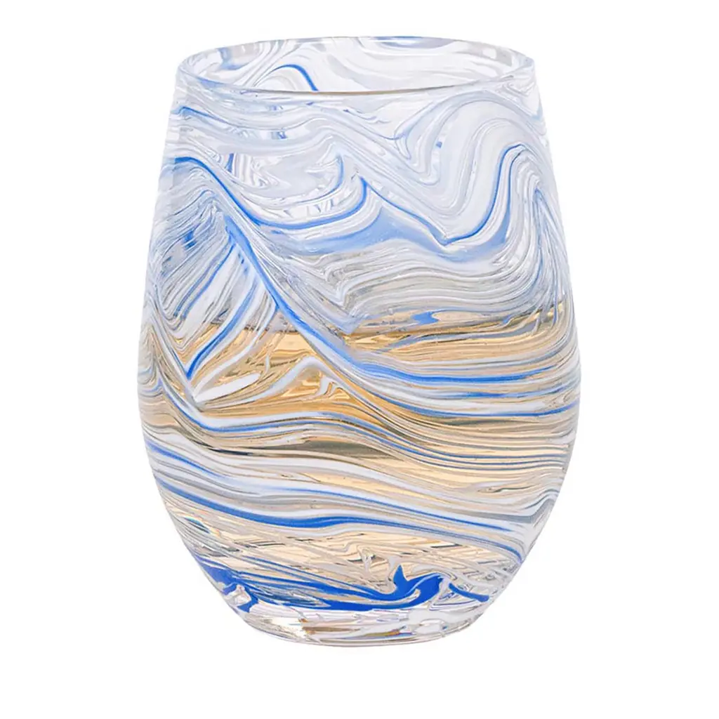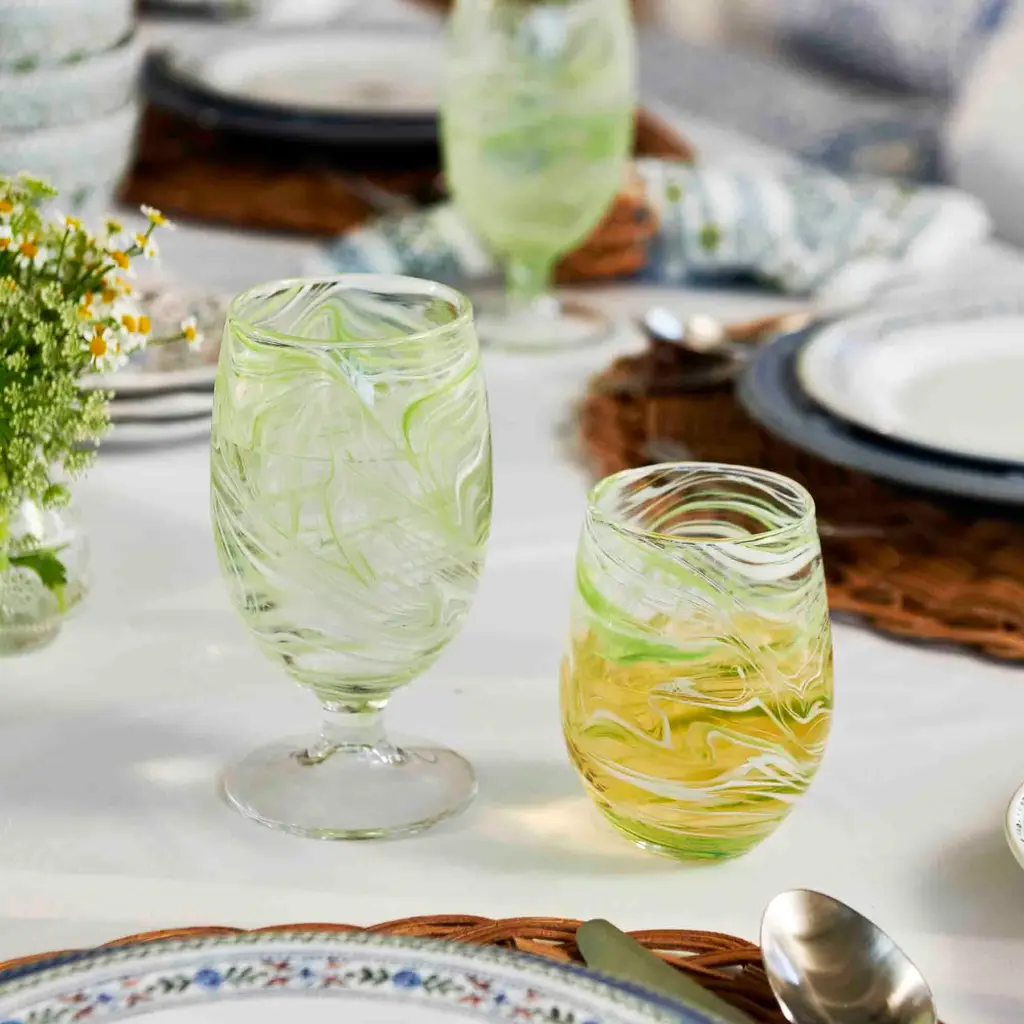 Like swirling water and the decorative pages of Florentine leather-bound books, the marbled lasses of Juliska's Puro Glass Collection add an eclectic splash to your everyday table with its captivating motif in soft seaglass hues of white, blue, and green for a joyful pop of color. These chic vessels are perfect for your morning juice and add a super stylish layer to place settings - the abstract pattern mixes beautifully with everything.