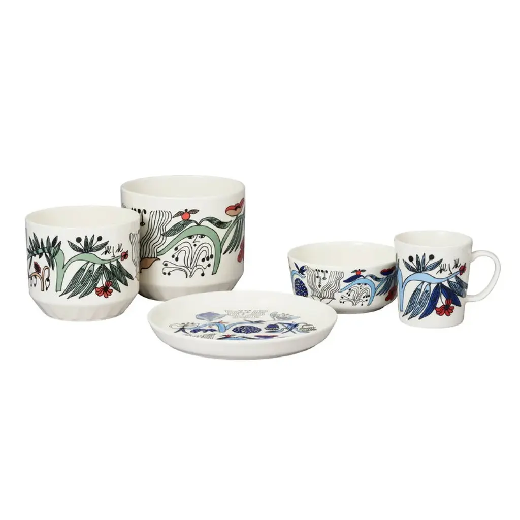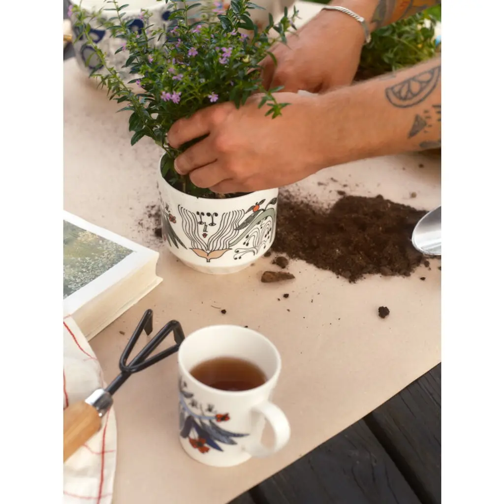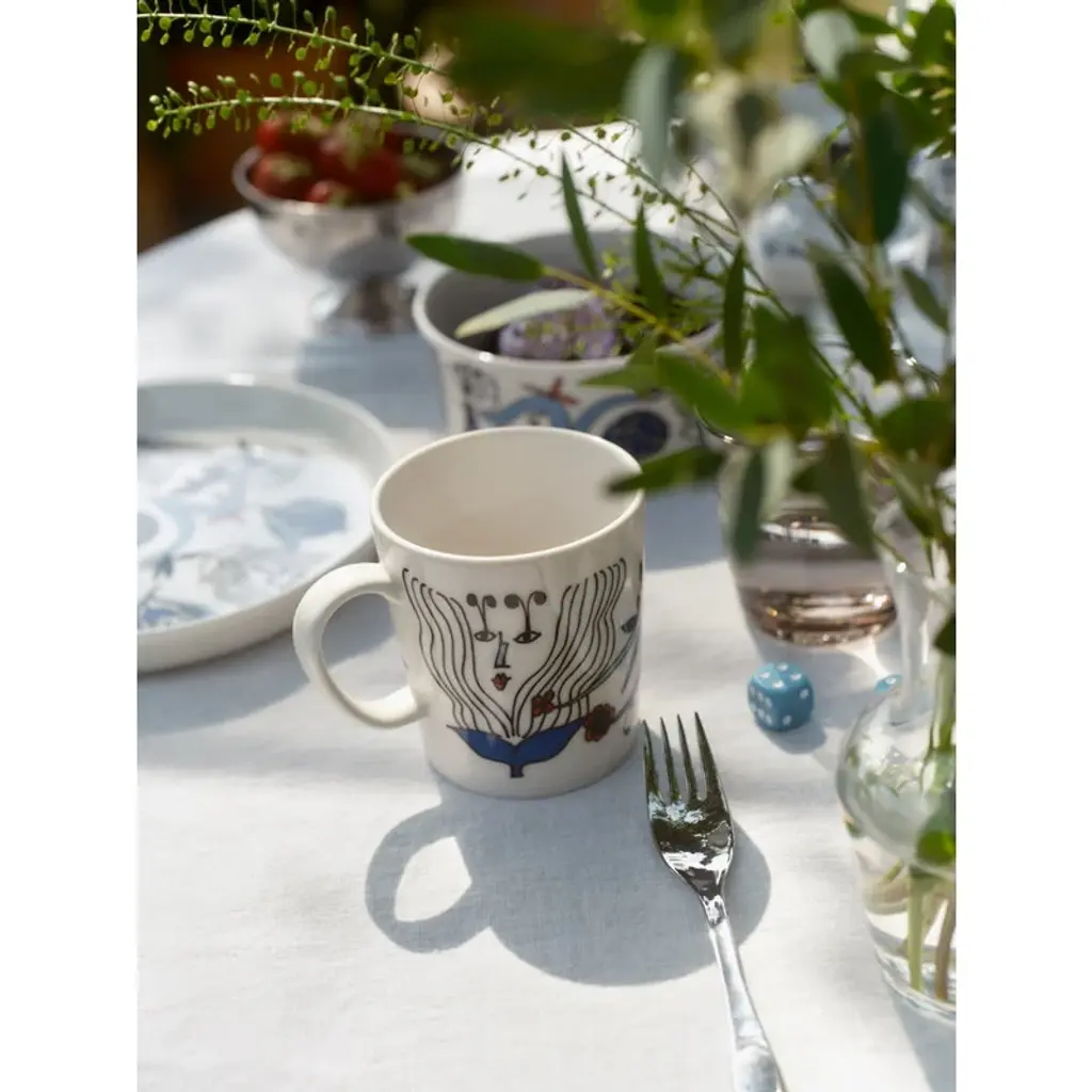 Arabia's Puutarhurit mug is adorned with a lively pattern created by the artist Armi Teva. The design features whimsical creatures that are hidden among garden flowers and leaves. The 10.14 fl oz (3 dl) mug is suitable for various beverages, from morning coffee to afternoon tea or warming cocoa in the evening.