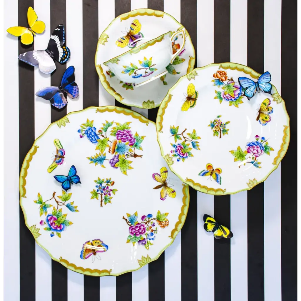 The original set, introduced in 1851 at the First World Exhibition in London, was purchased by Queen Victoria herself. Subsequently named for her, this Chinese-influenced pattern demands the skills of Herend's most talented and experienced painters. Hand painted in Hungary. Now the biggest porcelain manufactory in Europe, Herend was founded in 1826 to produce earthenware in the small Hungarian village for which it was named. At the time, Hungary was flooded with low-cost pottery, but in 1839, Mor Fischer became the Manufactory’s new owner and he decided to focus on producing dinnerware replacement pieces for Europe’s royal families to complement their valuable porcelain patterns from Germany and the Far East. As his client base grew, Fischer commissioned his artists to begin designing dinnerware patterns of their own. Queen Victoria’s 1851 purchase of a large set for Windsor Castle was a milestone, setting the stage for aristocrats throughout Europe to clamor for Herend in their estates. In the 1850s, Herend added meticulously-crafted figurines to its creations. Herend’s trademark fishnet pattern, which is widely recognized and prized as Herend’s signature design, started in 1858 when an artist who was intrigued with a Chinese plate’s fish scale design painted it onto a rooster figurine to imitate feathers.
