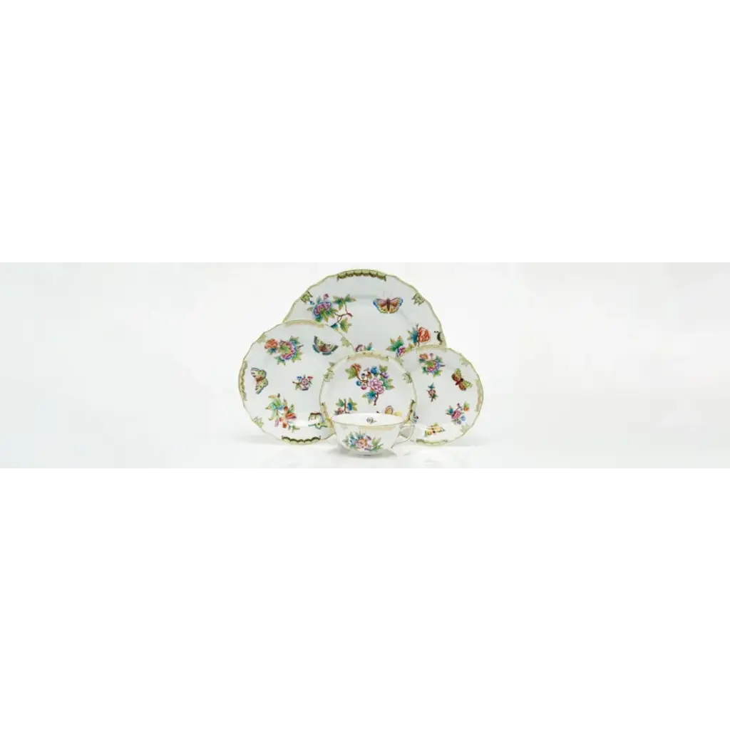 The original set, introduced in 1851 at the First World Exhibition in London, was purchased by Queen Victoria herself. Subsequently named for her, this Chinese-influenced pattern demands the skills of Herend's most talented and experienced painters. Hand painted in Hungary. Now the biggest porcelain manufactory in Europe, Herend was founded in 1826 to produce earthenware in the small Hungarian village for which it was named. At the time, Hungary was flooded with low-cost pottery, but in 1839, Mor Fischer became the Manufactory’s new owner and he decided to focus on producing dinnerware replacement pieces for Europe’s royal families to complement their valuable porcelain patterns from Germany and the Far East. As his client base grew, Fischer commissioned his artists to begin designing dinnerware patterns of their own. Queen Victoria’s 1851 purchase of a large set for Windsor Castle was a milestone, setting the stage for aristocrats throughout Europe to clamor for Herend in their estates. In the 1850s, Herend added meticulously-crafted figurines to its creations. Herend’s trademark fishnet pattern, which is widely recognized and prized as Herend’s signature design, started in 1858 when an artist who was intrigued with a Chinese plate’s fish scale design painted it onto a rooster figurine to imitate feathers.