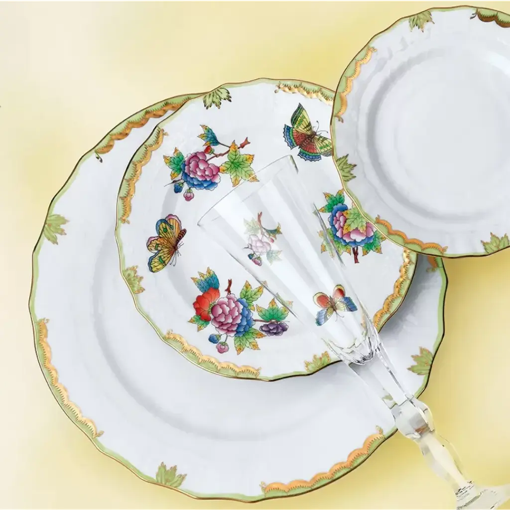 The original set, introduced in 1851 at the First World Exhibition in London, was purchased by Queen Victoria herself. Subsequently named for her, this Chinese-influenced pattern demands the skills of Herend's most talented and experienced painters. Hand painted in Hungary. Now the biggest porcelain manufactory in Europe, Herend was founded in 1826 to produce earthenware in the small Hungarian village for which it was named. At the time, Hungary was flooded with low-cost pottery, but in 1839, Mor Fischer became the Manufactory’s new owner and he decided to focus on producing dinnerware replacement pieces for Europe’s royal families to complement their valuable porcelain patterns from Germany and the Far East. As his client base grew, Fischer commissioned his artists to begin designing dinnerware patterns of their own. Queen Victoria’s 1851 purchase of a large set for Windsor Castle was a milestone, setting the stage for aristocrats throughout Europe to clamor for Herend in their estates. In the 1850s, Herend added meticulously-crafted figurines to its creations. Herend’s trademark fishnet pattern, which is widely recognized and prized as Herend’s signature design, started in 1858 when an artist who was intrigued with a Chinese plate’s fish scale design painted it onto a rooster figurine to imitate feathers.