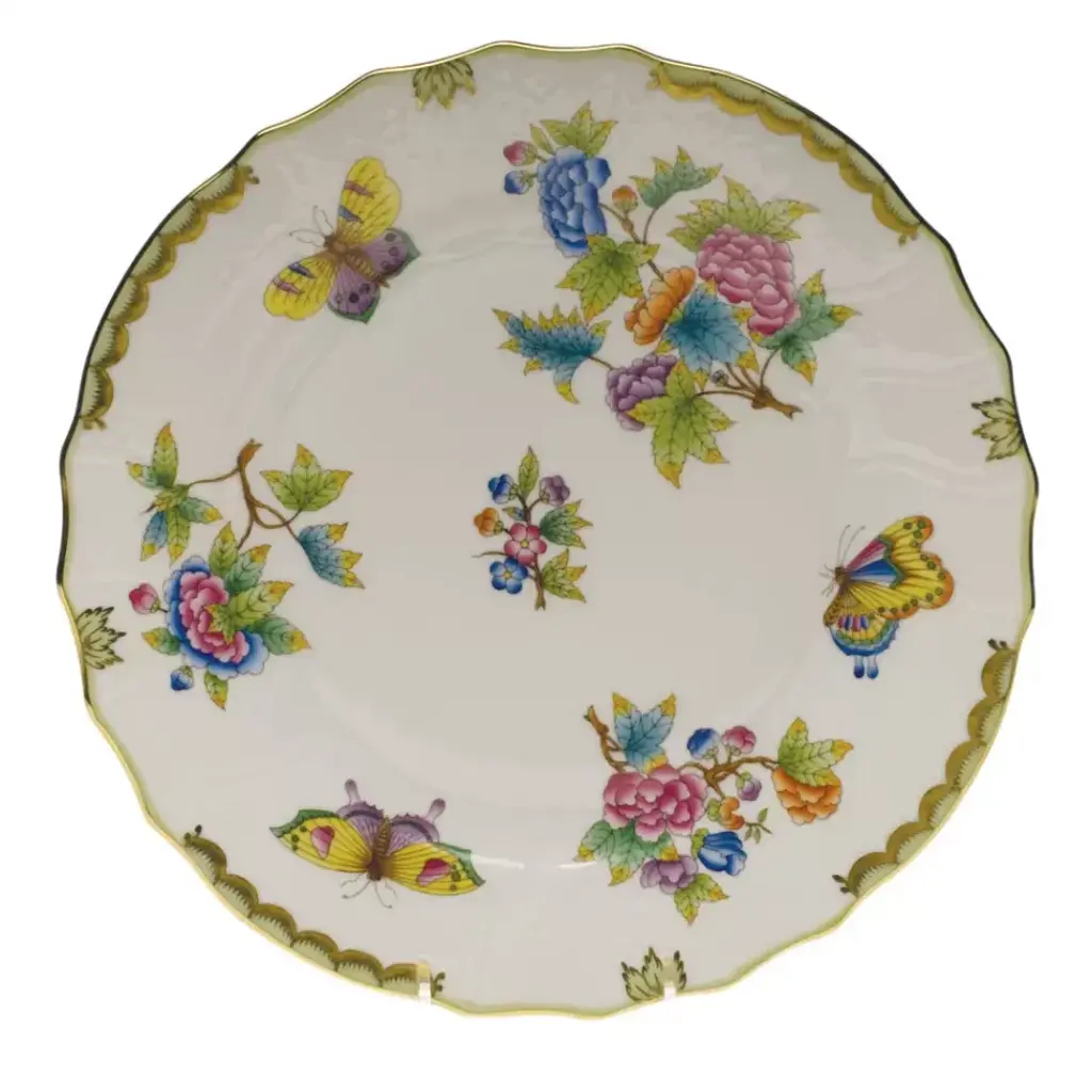 The original set, introduced in 1851 at the First World Exhibition in London, was purchased by Queen Victoria herself. Subsequently named for her, this Chinese-influenced pattern demands the skills of Herend's most talented and experienced painters. Hand painted in Hungary. Now the biggest porcelain manufactory in Europe, Herend was founded in 1826 to produce earthenware in the small Hungarian village for which it was named. At the time, Hungary was flooded with low-cost pottery, but in 1839, Mor Fischer became the Manufactory’s new owner and he decided to focus on producing dinnerware replacement pieces for Europe’s royal families to complement their valuable porcelain patterns from Germany and the Far East. As his client base grew, Fischer commissioned his artists to begin designing dinnerware patterns of their own. Queen Victoria’s 1851 purchase of a large set for Windsor Castle was a milestone, setting the stage for aristocrats throughout Europe to clamor for Herend in their estates. In the 1850s, Herend added meticulously-crafted figurines to its creations. Herend’s trademark fishnet pattern, which is widely recognized and prized as Herend’s signature design, started in 1858 when an artist who was intrigued with a Chinese plate’s fish scale design painted it onto a rooster figurine to imitate feathers.