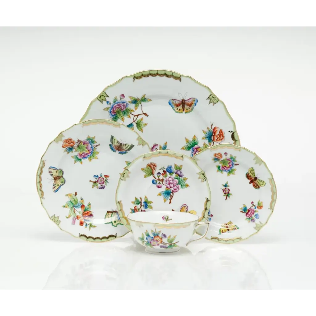The original set, introduced in 1851 at the First World Exhibition in London, was purchased by Queen Victoria herself. Subsequently named for her, this Chinese-influenced pattern demands the skills of Herend's most talented and experienced painters. Hand painted in Hungary. Now the biggest porcelain manufactory in Europe, Herend was founded in 1826 to produce earthenware in the small Hungarian village for which it was named. At the time, Hungary was flooded with low-cost pottery, but in 1839, Mor Fischer became the Manufactory’s new owner and he decided to focus on producing dinnerware replacement pieces for Europe’s royal families to complement their valuable porcelain patterns from Germany and the Far East. As his client base grew, Fischer commissioned his artists to begin designing dinnerware patterns of their own. Queen Victoria’s 1851 purchase of a large set for Windsor Castle was a milestone, setting the stage for aristocrats throughout Europe to clamor for Herend in their estates. In the 1850s, Herend added meticulously-crafted figurines to its creations. Herend’s trademark fishnet pattern, which is widely recognized and prized as Herend’s signature design, started in 1858 when an artist who was intrigued with a Chinese plate’s fish scale design painted it onto a rooster figurine to imitate feathers.