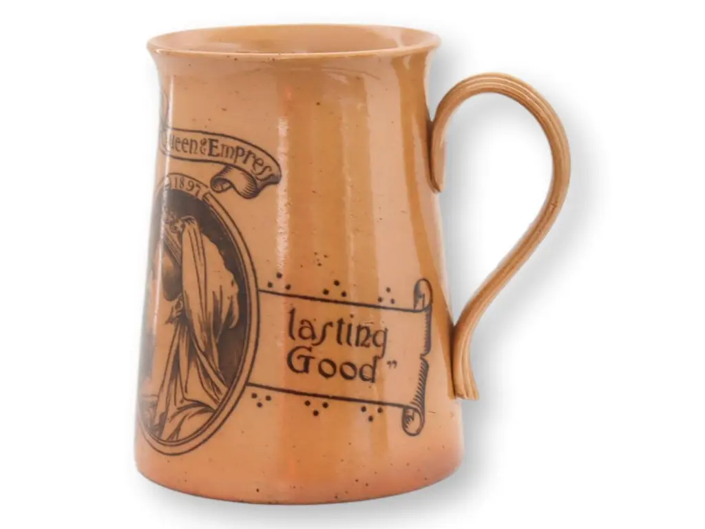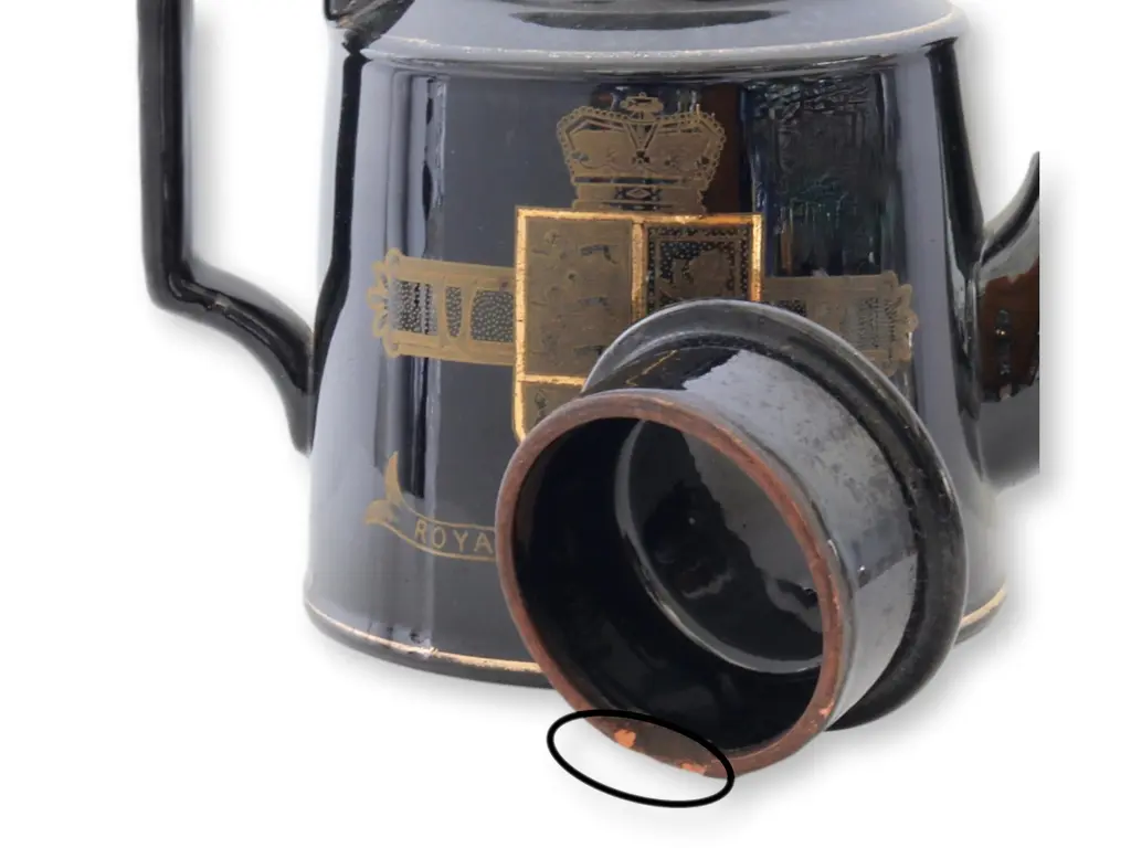 Celebrate history with this Queen Victoria 1887 Royal Jubilee teapot. Crafted to commemorate a significant era, its design reflects the grandeur and elegance of the Victorian age. Whether used to serve tea or displayed as a cherished keepsake, this teapot adds a regal touch to any collection. A timeless piece that honors a golden period of British royalty. Glossy Jackfield glaze, raised enameling over a terra cotta base. No maker's mark.