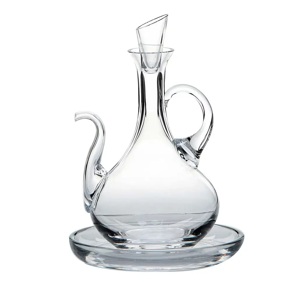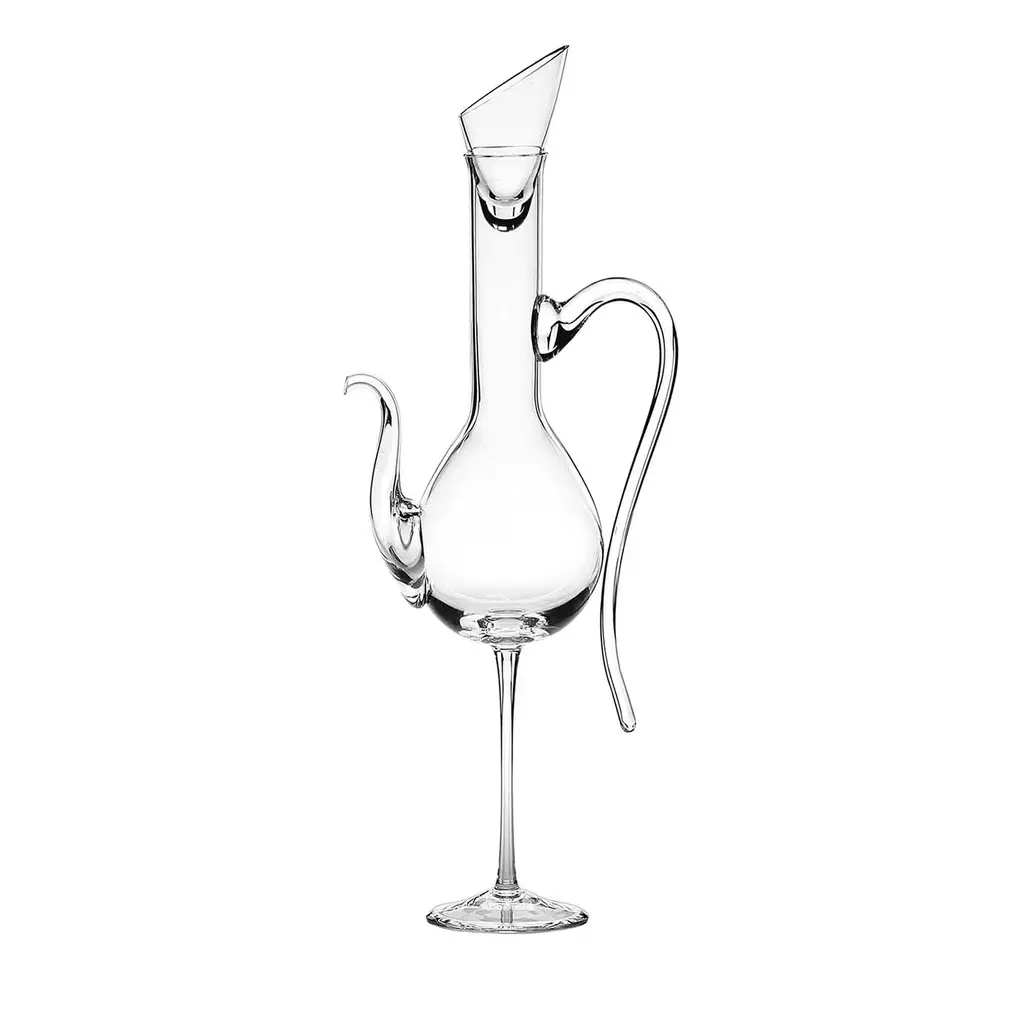 This delicate decanter is entirely crafted in transparent glass and features a classic silhouette which leans slightly forward making it perfect for pouring. Like other pieces in this collection, this piece was inspired by animals in the natural world, specifically a rabbit. On one side of the lip, two rabbit ears sit up at attention. At the base of the piece, a small rabbit tail is featured. This charming piece will be perfect in a contemporary setting and it will make a statement when placed among other glass pieces by the same designer.