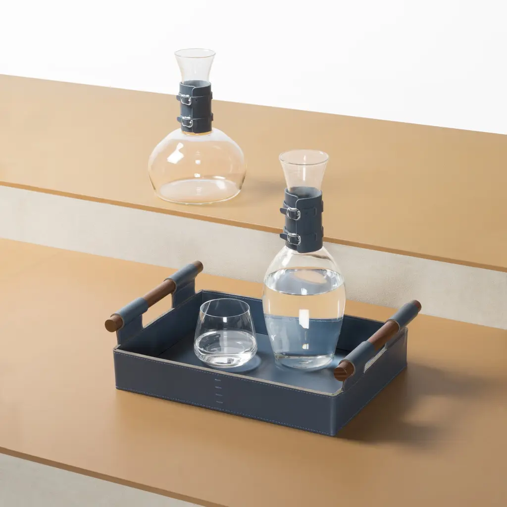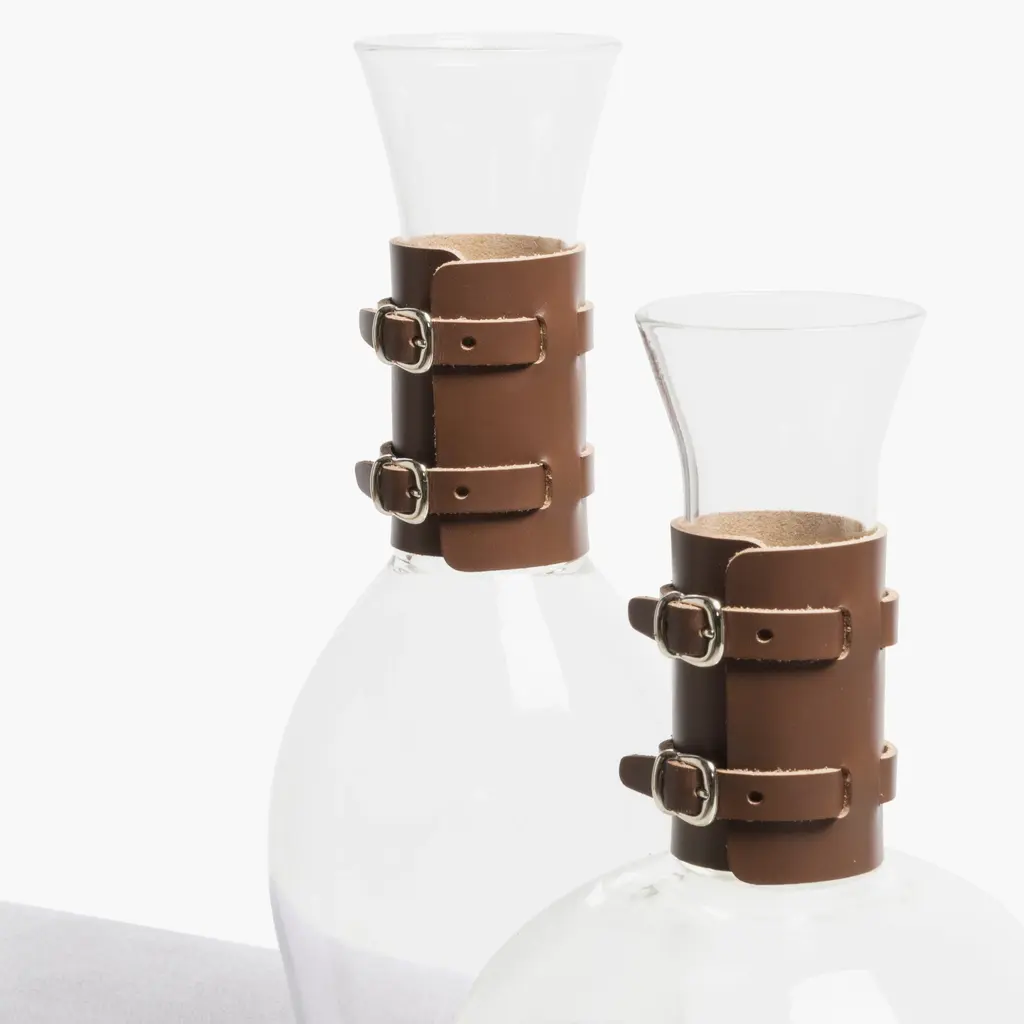 A masterful pairing of rugged elegance and refined transparency, the Rabitti 1969 Echo Pitcher from Rabitti 1969 elevates the art of serving. Crafted in Italy from durable borosilicate glass, it is handsomely wrapped in a removable saddle leather sleeve detailed with decorative buckles for a distinctive, sartorial touch. This stunning piece brings a warm, textural element to any table, perfect for serving everything from chilled water to cocktails with impeccable style. Highlights: