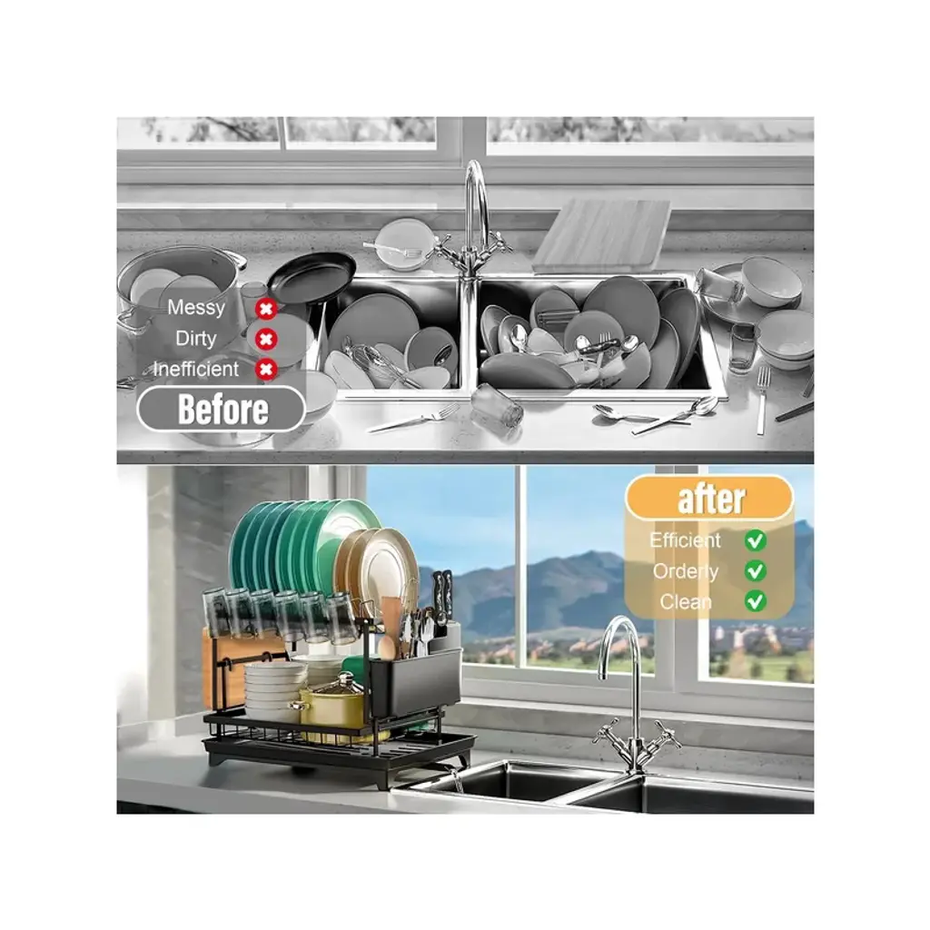 2-TIER LARGE CAPACITY: With a practical 2-tier design, Sakugi dish drainer for kitchen counter enables you to store different types and sizes of kitchenware, such as bowls, dishes, knives, wine glasses, kitchen pots, and frying pans. This 2-tier dish drying rack is perfect for families of 3-4 persons. RUSTPROOF MATERIAL: Sakugi kitchen dish drying rack is made of premium stainless steel, which is long-term use and will not rust or deform. Sakugi stainless steel dish drying rack keeps your countertop clean and organized all the time. (Note: Make sure the height between the countertop and cabinet is higher than 23.6 inch to fit into the rack.) MULTIPURPOSE DISH RACK: Sakugi multifunctional dish drying rack with multiple accessories. They can efficiently help you to store diverse kitchenware. Sakugi dishes drying rack can meet all your needs for storing and drying kitchenware. EASY TO INSTALL & CLEAN: Sakugi dish drainer is easy to install with the attached installation manual and accessories. In addition, with the waterproof black coating, the rack is also easy to clean. All you need to do is wipe the rack with a damp cloth or rinse it under a running tap after use. Easy-to-Clean Removable Parts: The dish rack features detachable components, allowing for hassle-free cleaning and maintaining a hygienic environment for your tableware.