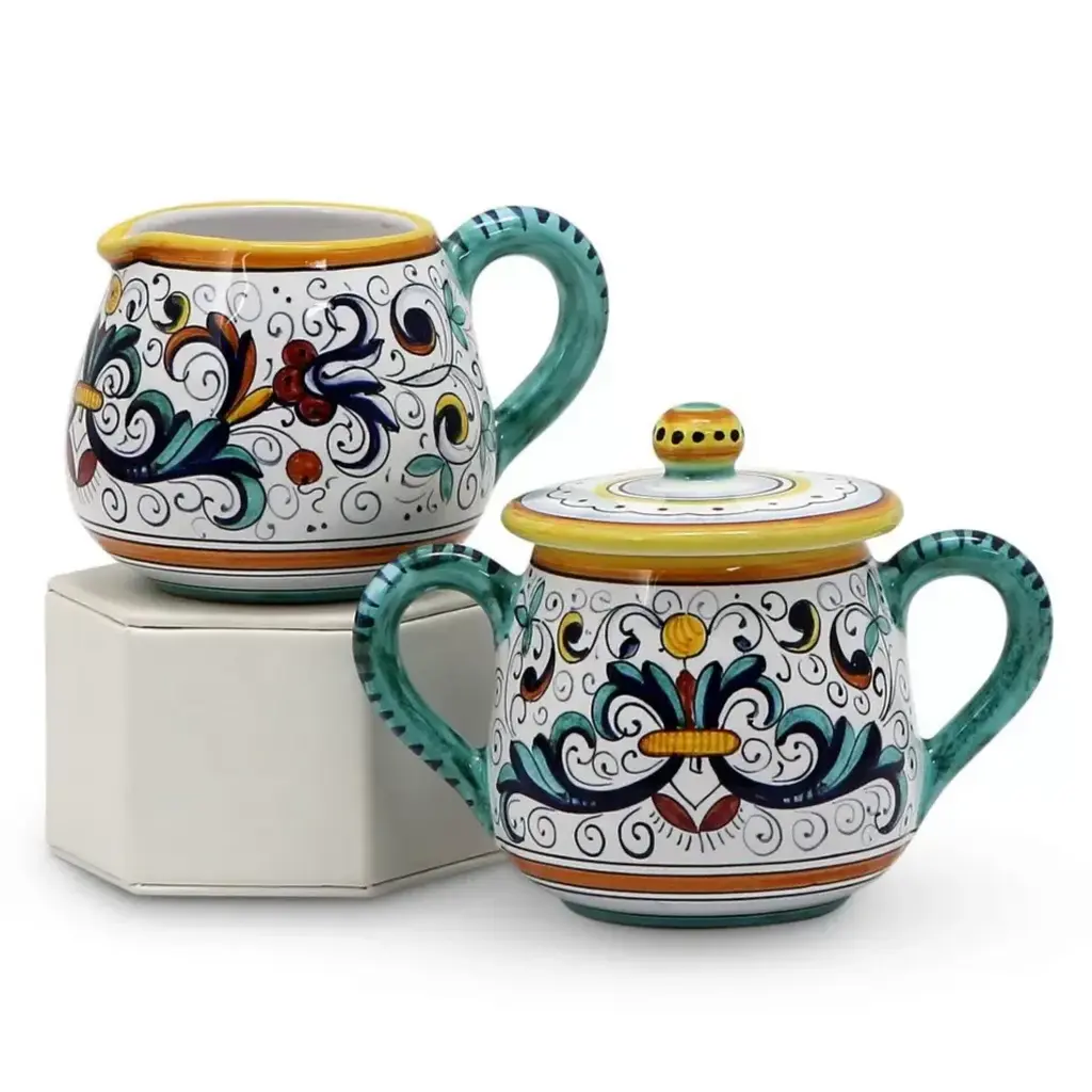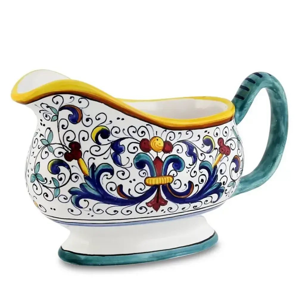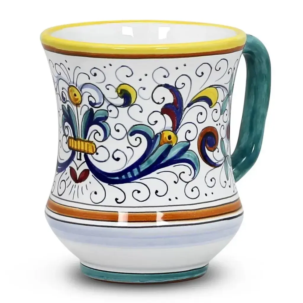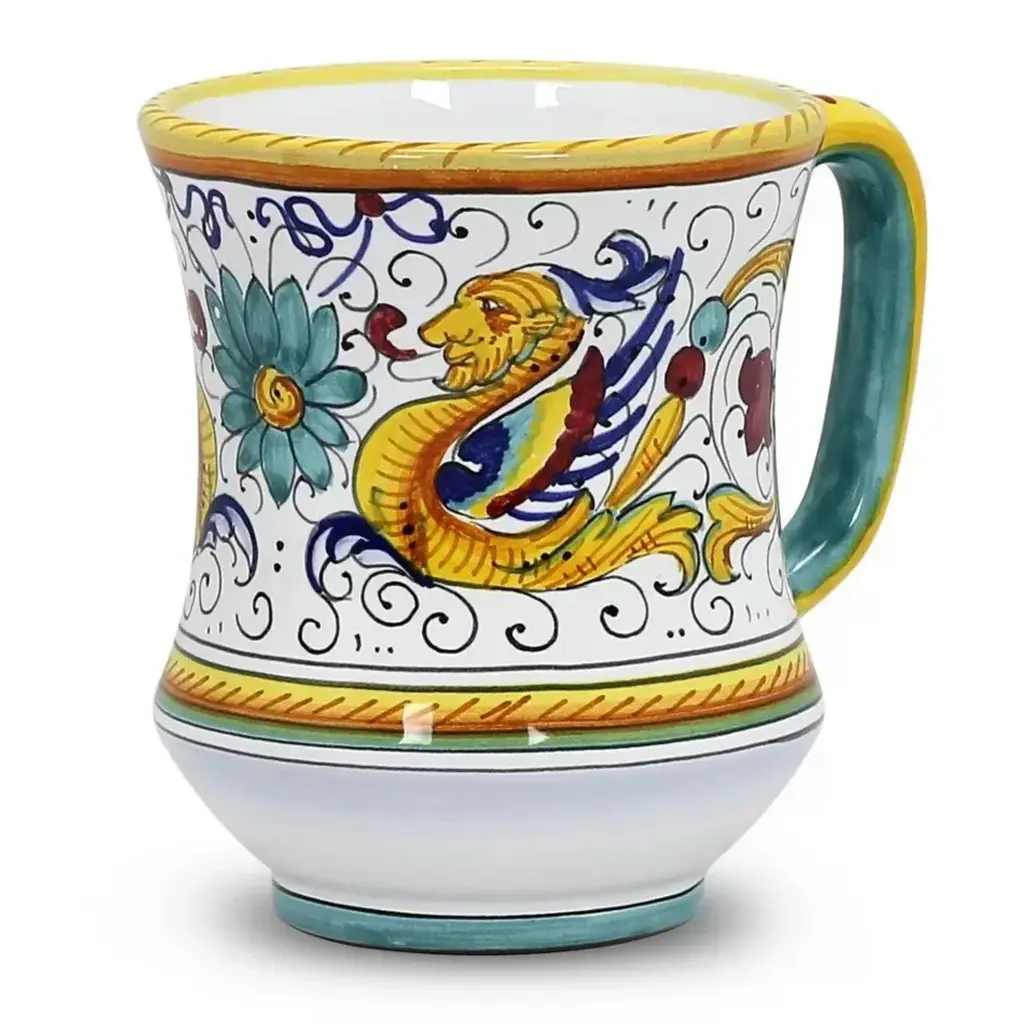 RAFFAELLESCO Collection: Among the most popular and enduring Italian majolica patterns, the classic Raffaellesco traces its origin to 16th century, and the graceful arabesques of Raphael's famous frescoes. The stylized dragon of the central motif was reputedly painted first by Raphael, a master painter and architect of the Italian High Renaissance. Raffaellesco is a benevolent deity who bestows good luck and fair winds to seagoing merchants, thus the puffs of wind steaming from the dragon's mouth. Hand made in Deruta-Italy. All Deruta of Italy products are lead and cadmium Free. Dishwasher Safe Not recommended for microwave use. Size (inches): 6 WIDE X 10 High (1 Liter)