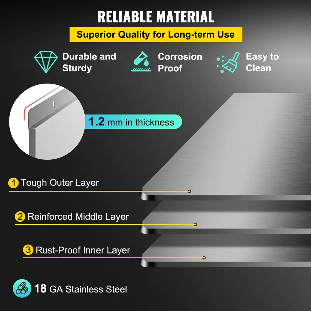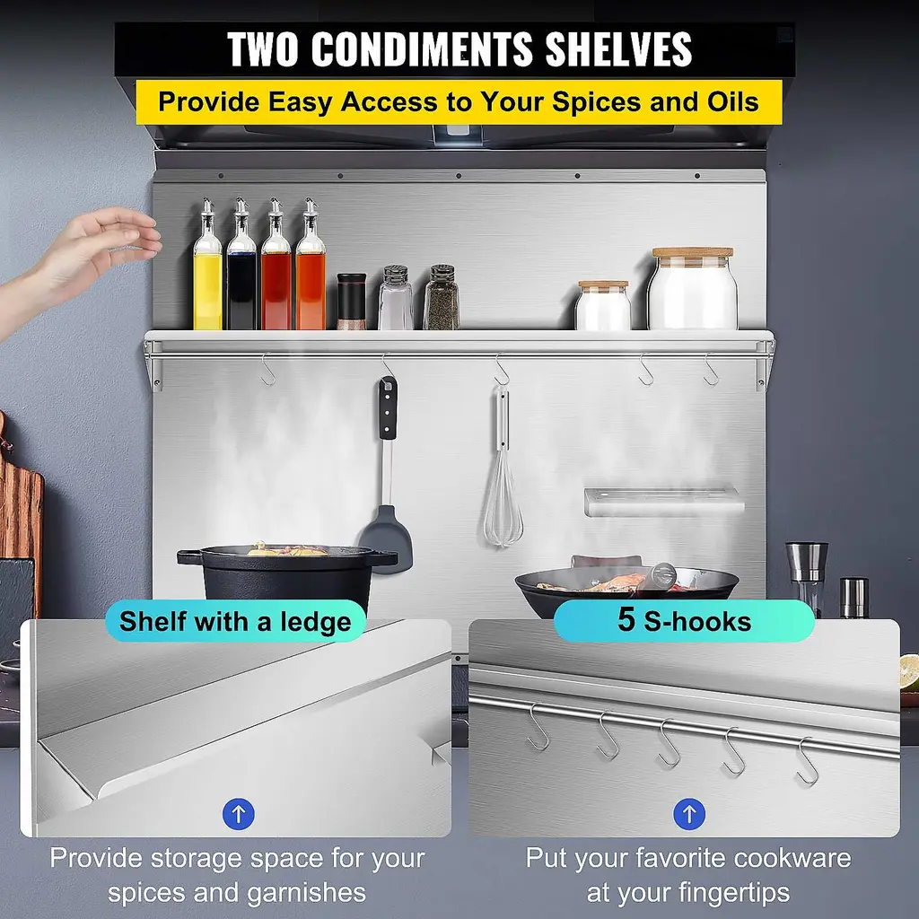 Stainless Steel Backsplash: Made of thickened 18 GA stainless steel material (1.2 mm thick) with a NO.4 brushed finish for durability and sturdiness. It is specifically designed to match current range hood models, adding a harmonious, modern style to your kitchen. Easy to Install: Simple structure with 10 pre-drilled holes, easy to install on the kitchen wall. It has increased stability after installation and will not fall off. The condiment holder and knife holder can also be conveniently mounted on the range's tailgate using the screws provided. Built-in Storage Shelf & Rack: This backsplash features a shelf, and six hooks for storing your spices, oils, and cooking utensils. Put your favorite cookware right within reach of your fingertips. Upgraded Knife Shelf: In addition to storage racks and shelves, the backsplash gives you a knife holder for knives. Multiple holes accommodate knives of different sizes. Keep your knives looking sharp and never miss a step with our high-quality backsplash. Wide Application: Our cook top backsplash keeps the wall behind the cooking surface away from oil splatters and offers a new look for your kitchen. This visually appealing unit fits into any setting. Perfect for your kitchen or cooking area. Package Content 1 x Range Backsplash 1 x Storage Shelf 1 x Knife Shelf 5 x Hooks 1 x Accessories Kit 1 x User Manual