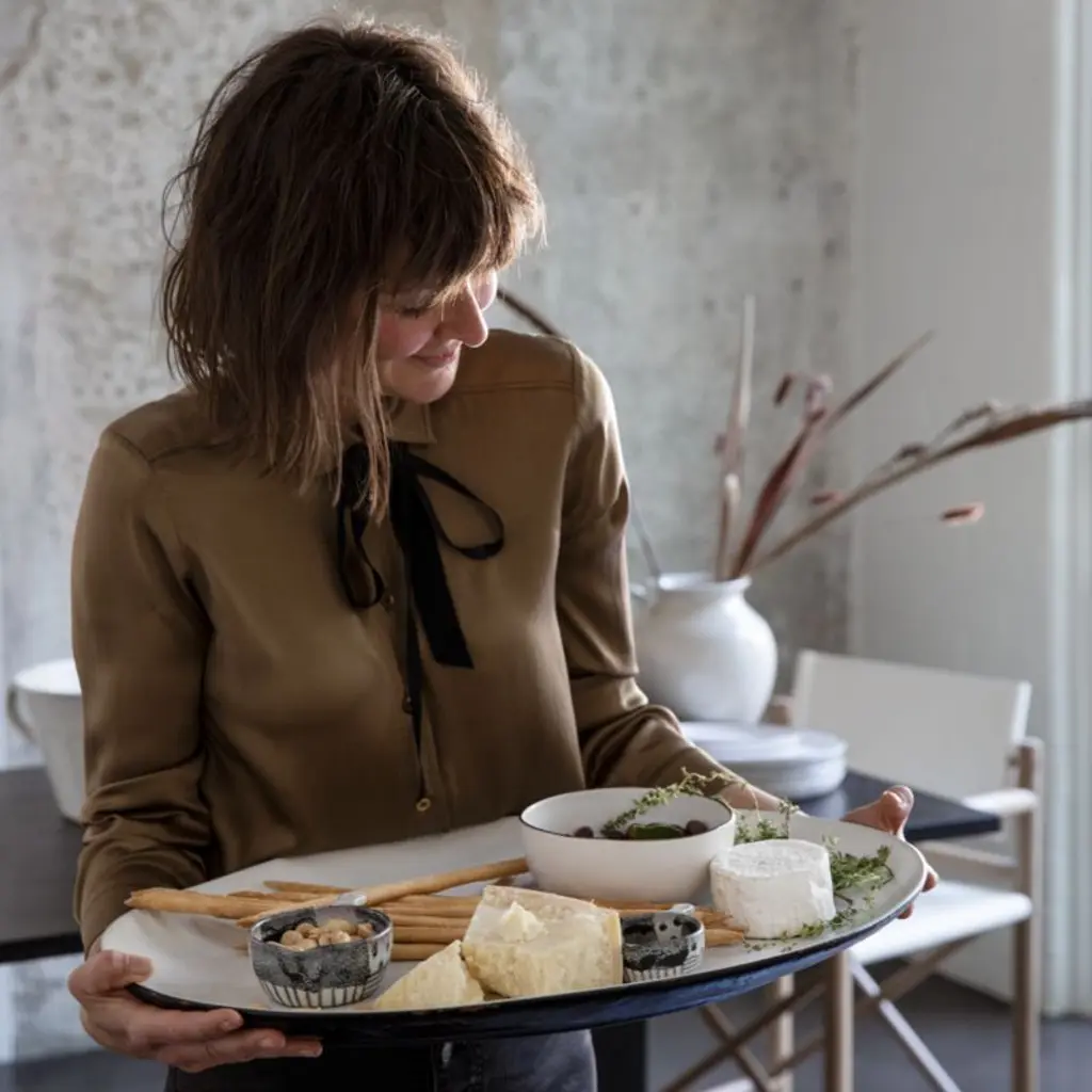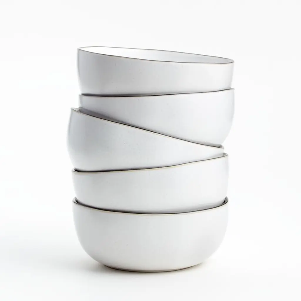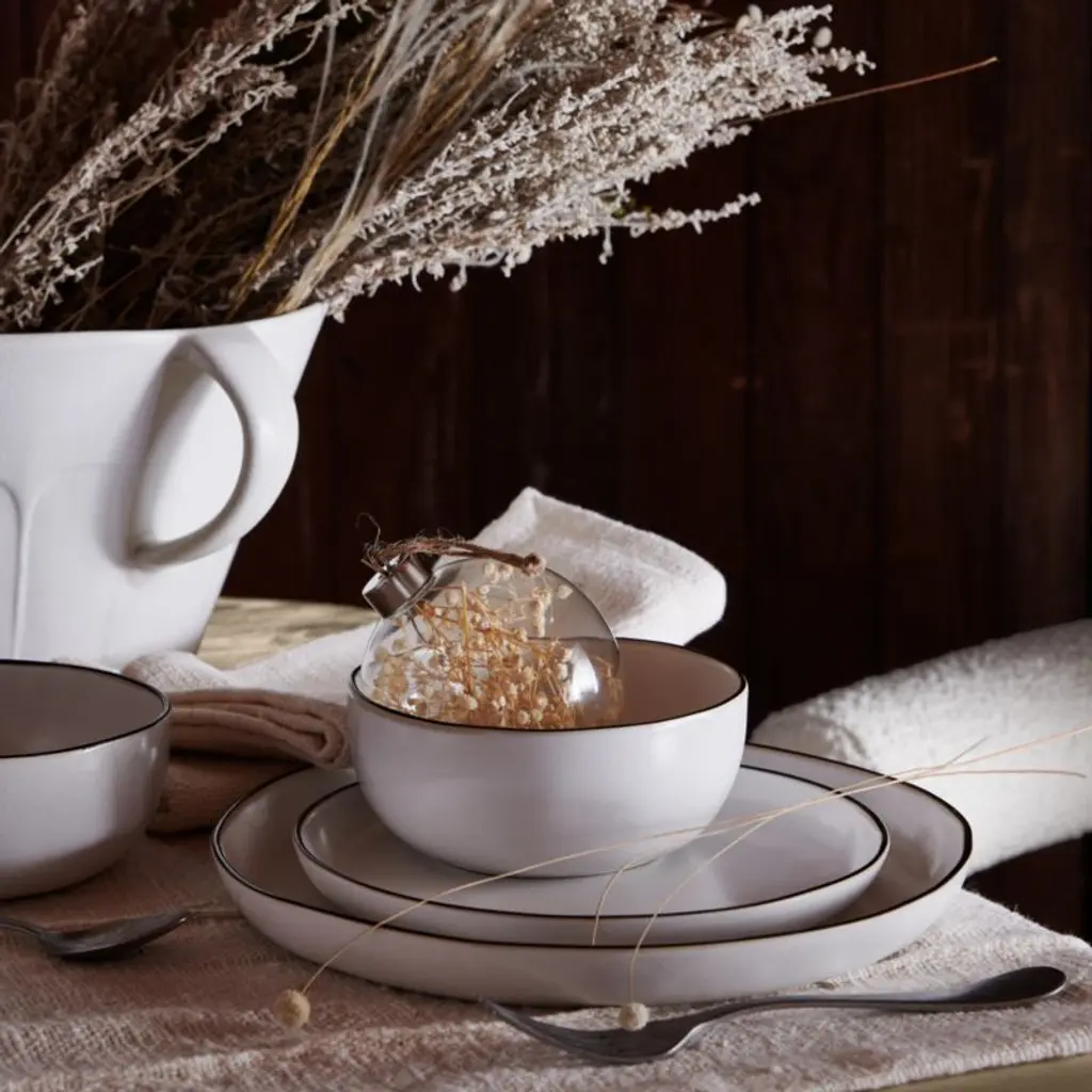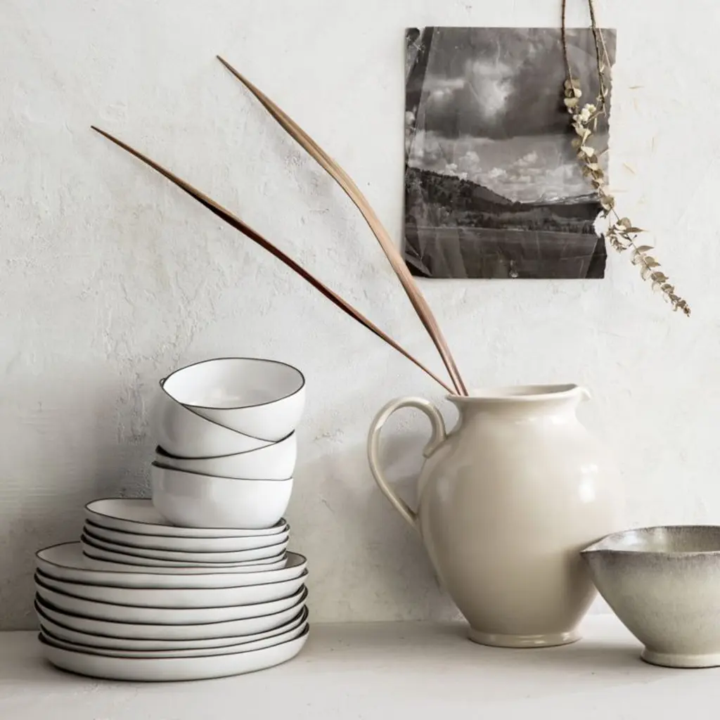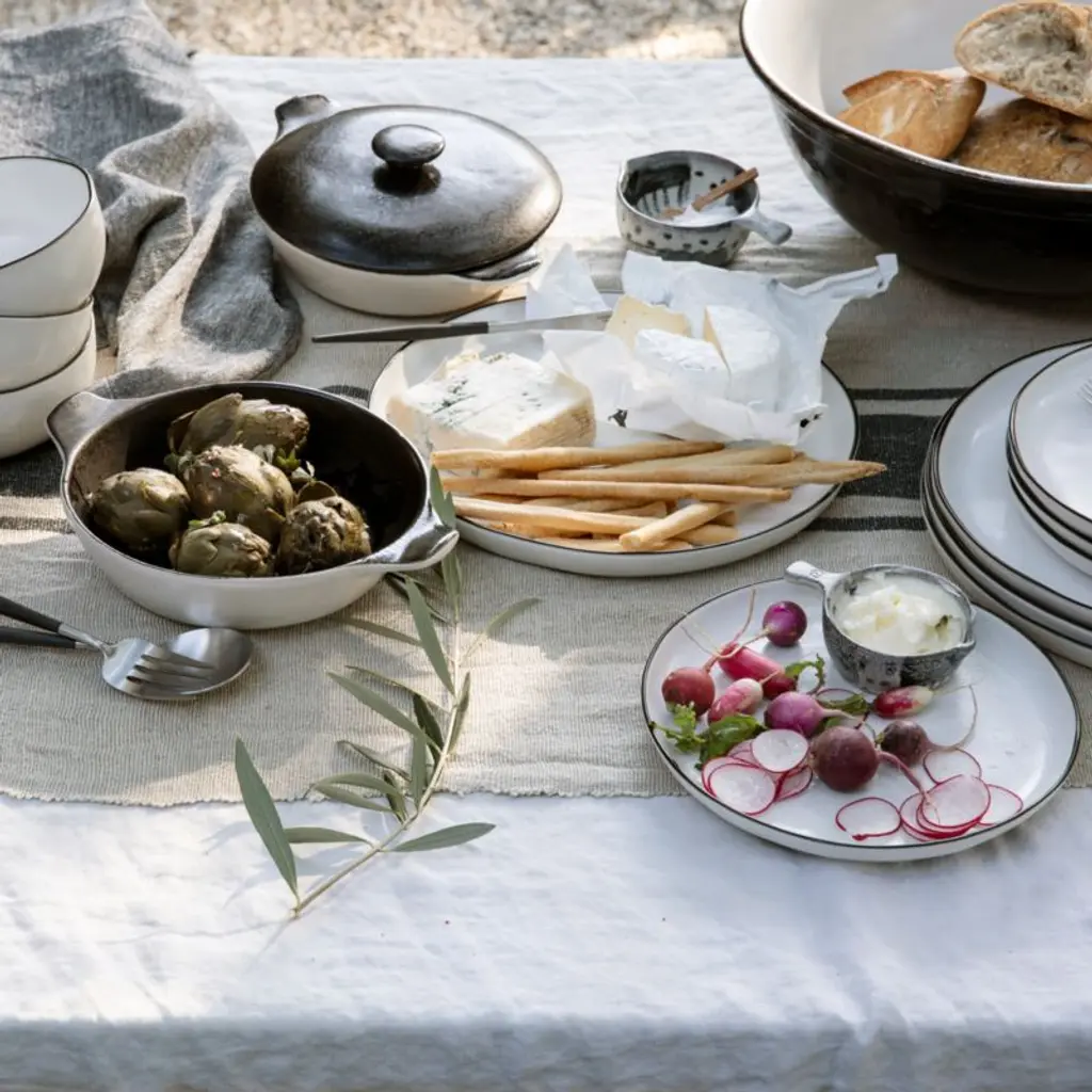 Rimmed in black, our white-glazed Range bowl showcases its perfectly imperfect artisanal edges. Hand-finished and -painted by talented craftspeople, the fine stoneware dish goes from warm oven to table for a laid-back yet elevated look. The bowl cleans up easily in the dishwasher. Set a harmonious table with the coordinating black-and-white dinnerware, oven-to-table serveware and accessories in our exclusive collection designed by Leanne Ford.Curated and crafted around the world, our first furniture and decor collaboration with design star Leanne Ford brings her cool, effortless vibe home to you.