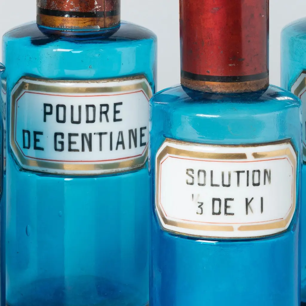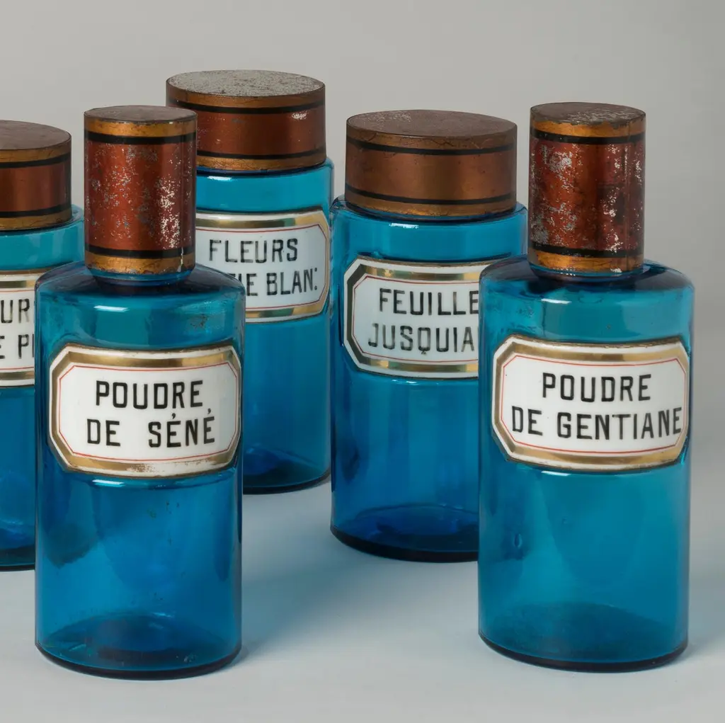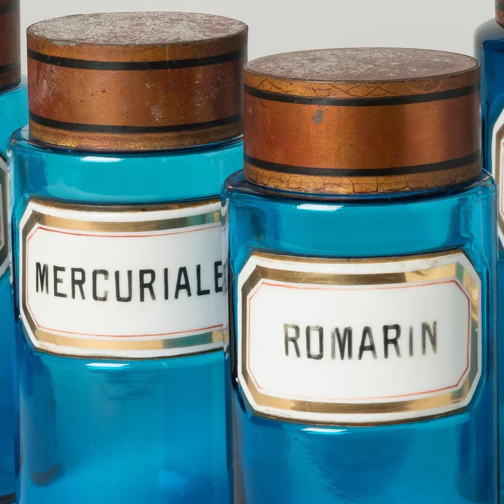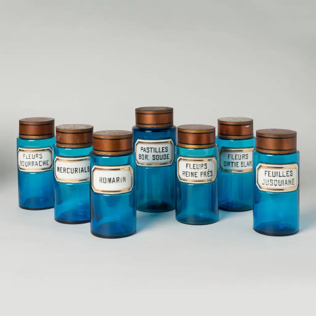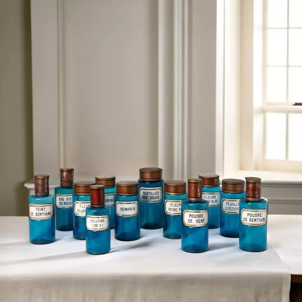A Rare Set of 12 Turquoise Glass Apothecary Jars & BottlesWith original opaline labels and tole lids. Stamped Paris PL Deposit, most probably retailed by Lefébure.Paris, circa 1880Dimensions: H: 10 in / 25 cmVerreries and cristalleries Lefébure & Co was established in Paris in 1806, becoming the leading specialists in glass containers, jars, and perfume flasks. The quality of their glass earned them many accolades at the international expositions, including a gold medal at the 1886 Paris expo.