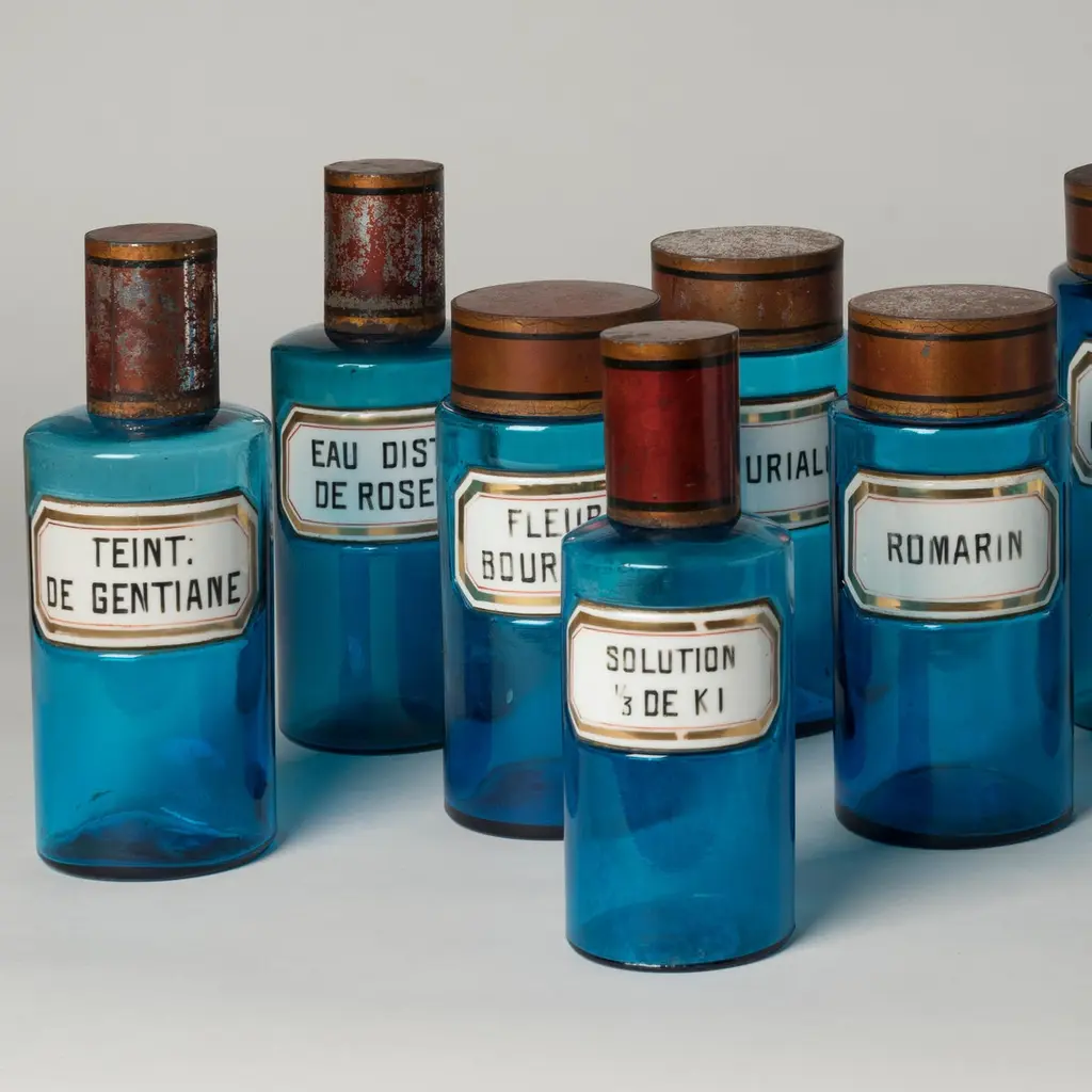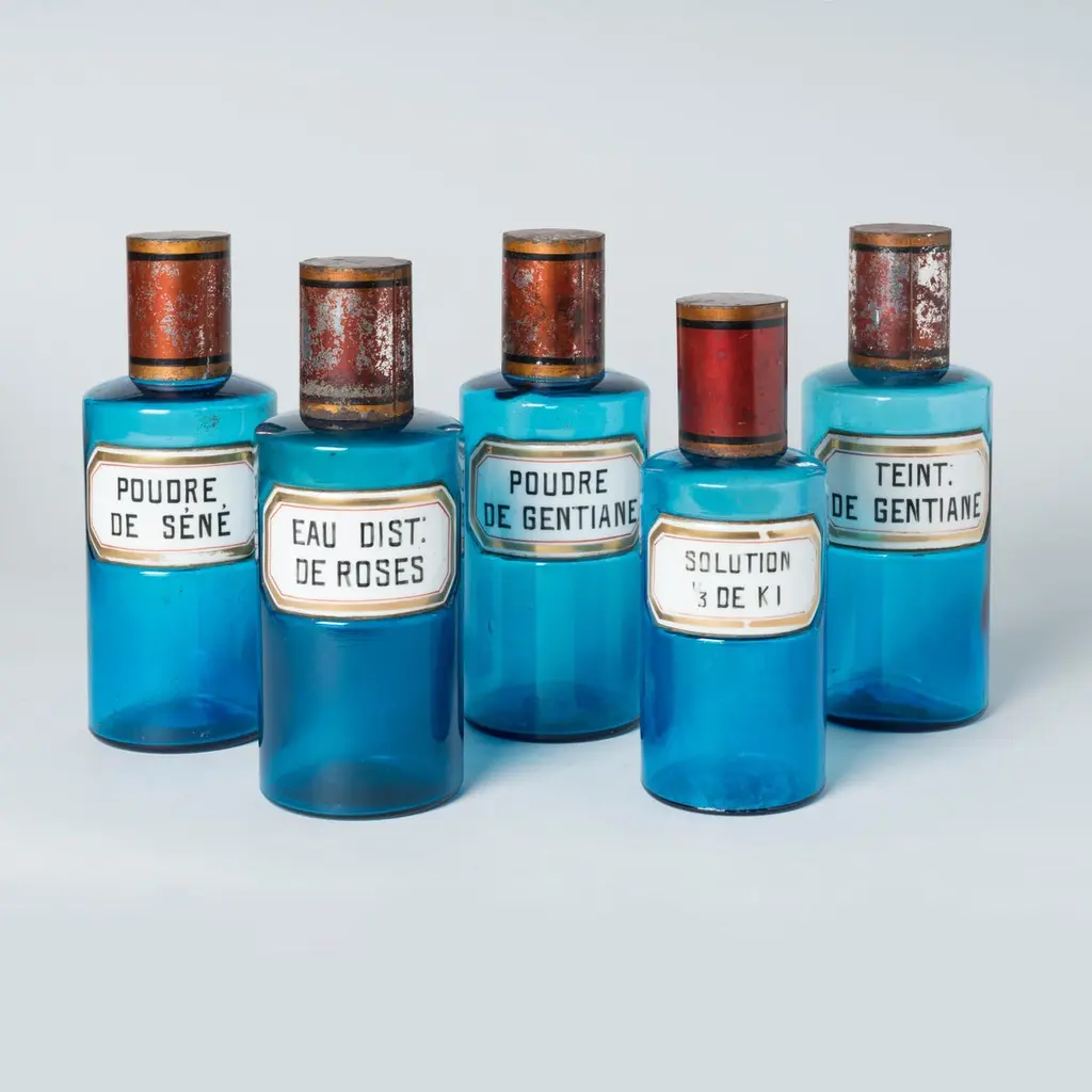 Rare Set Of Twelve 19th Century French Blue Glass Apothecary Jars & Bottles