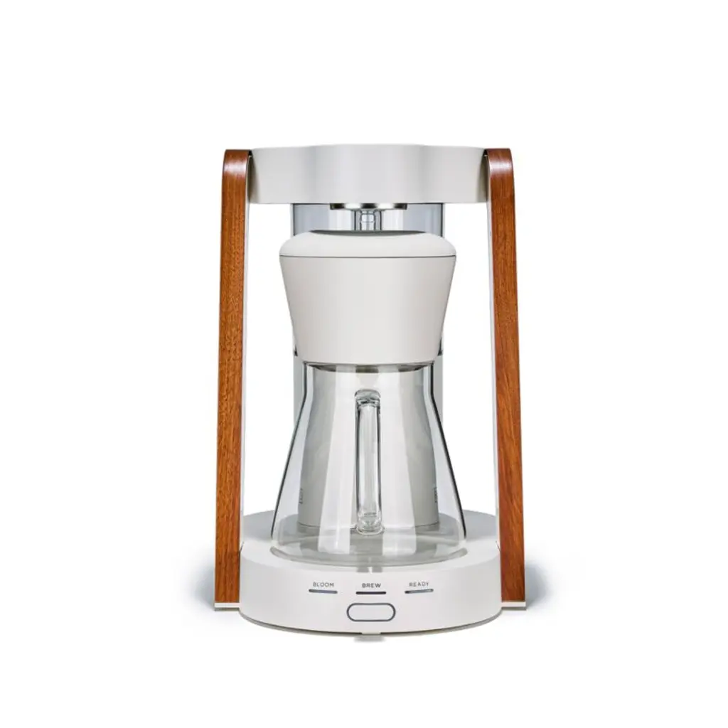 Enjoy pour-over style coffee without the gear and effort. Just a push of the button delivers a half or full carafe of delicious, barista-quality coffee. The thoughtfully designed and hand-assembled machine removes variables by heating water to the ideal extraction temperature and precisely metering water flow during the bloom and brew phases to replicate the painstaking pour-over process. What's more, the coffee maker limits exposure to plastic once the water begins to heat with a brewing path of stainless steel and glass. The double-walled thermal carafe keeps your coffee hot for up to 90 minutes. An exclusive linen-white finish and hand-sanded solid walnut trim complement the coffee maker's streamlined design, bringing high style along with top-notch coffee to your countertop.