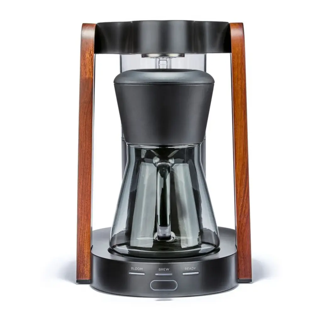 Enjoy pour-over style coffee without the gear and effort. Just a push of the button delivers a half or full carafe of delicious, barista-quality coffee. The thoughtfully designed and hand-assembled machine removes variables by heating water to the ideal extraction temperature and precisely metering water flow during the bloom and brew phases to replicate the painstaking pour-over process. What's more, the coffee maker limits exposure to plastic once the water begins to heat with a brewing path of stainless steel and glass. The double-walled thermal carafe keeps your coffee hot for up to 90 minutes. A matte black finish and hand-sanded solid walnut trim complement the coffee maker's streamlined design, bringing high style along with top-notch coffee to your countertop.
