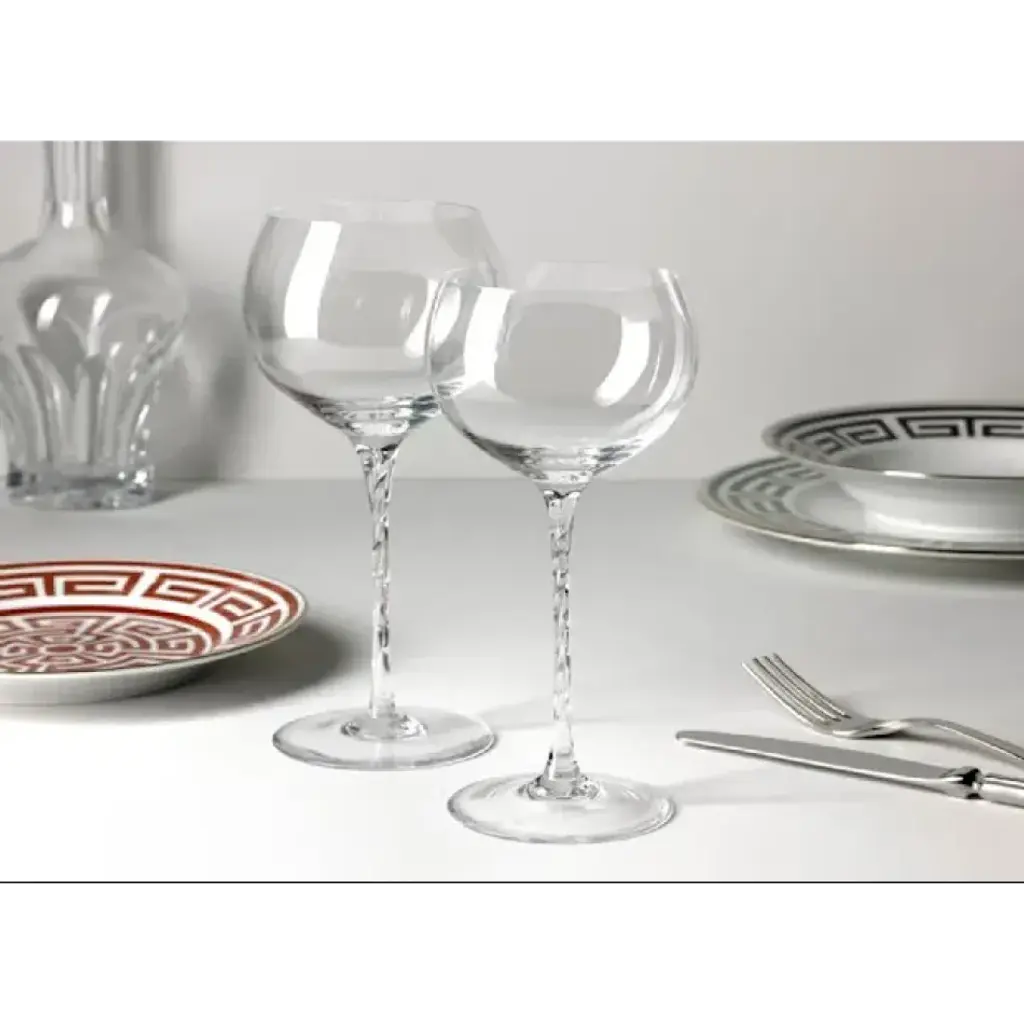 The Reale wine goblets by Ginori 1735 are an essential element for your table. Made of mouth-blown glass, these crystal wine glasses stand out for their elegant and contemporary design. The Ginori wine goblets, 20 cm tall and with a capacity of 250 ml, are perfect for an everyday luncheon, but also for a special dinner. The wine goblet set features the characteristic interlocking finish of the stem that lends a dynamic touch to your mise en place. All the crystal wine goblets in the Reale collection are unique examples made according to the techniques of fine Made in Italy craftsmanship. Our mouth-blown crystal red wine goblets are quality items that guarantee outstanding longevity and perfect aesthetics. The crystal of the Reale service, to which these design wine goblets belong, represents the essence of modern conviviality. The large, sinuous shapes fit perfectly into any combination, creating a contemporary and versatile atmosphere. The original intertwining of the stem of the goblets lends dynamism to the presentation of the dishes, for a unique and unmistakable style that bears the Ginori 1735 name.