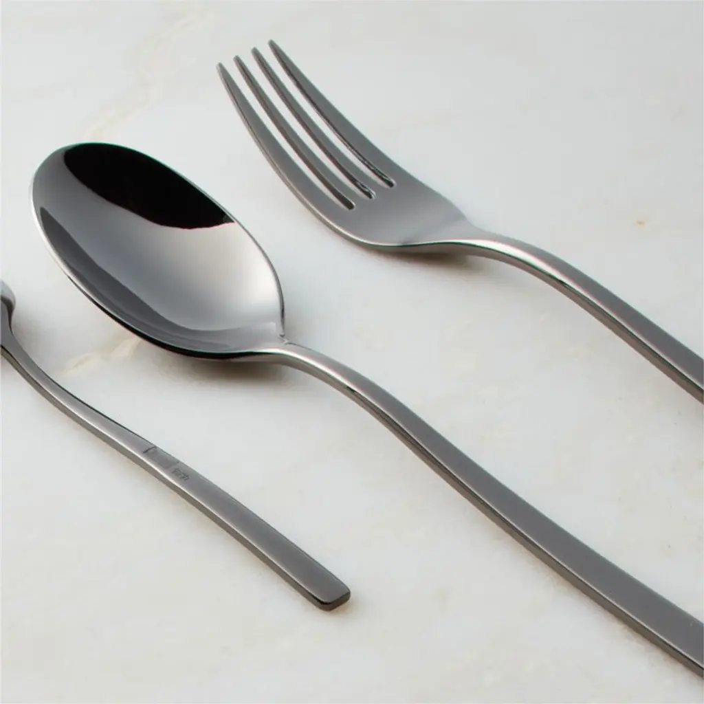 Made of the highest-quality 18/10 stainless steel for superior performance, modern flatware set sports a mirror-polished black finish and slim, tapered handles. Designed by Mepra, a family-owned company founded in 1947 and stewarded by three generations of the Prandelli family. Mepra flatware is frequently found in fine dining restaurants and the homes of A-list stars due to its design, quality and exceptional durability. Each five-piece place setting includes a dinner fork, salad fork, knife, spoon and dessert spoon.