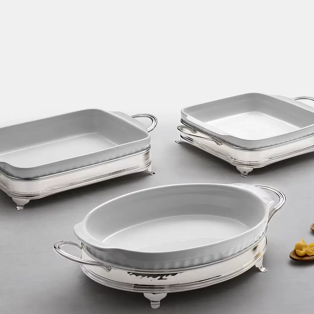 Elegance and luxury define this tableware set comprised of a rectangular white ceramic baking dish and a specific silver-plated brass holder with handles. Showcasing a gleaming finish, the holder comes complete with tiny feet allowing for the baking dish to be brought to the table even when still hot. Square and round counterparts are also available in the Artemest catalog.