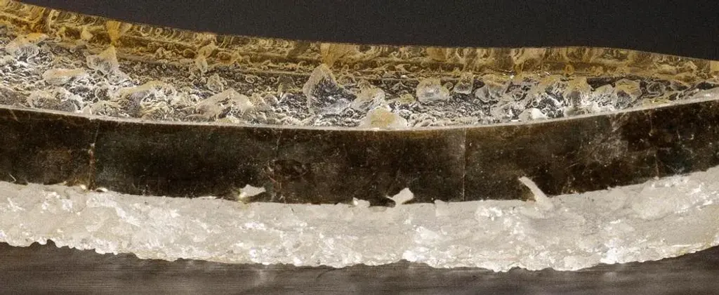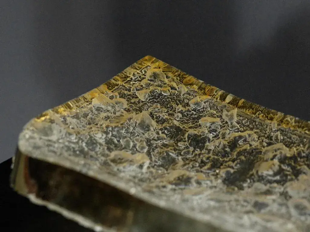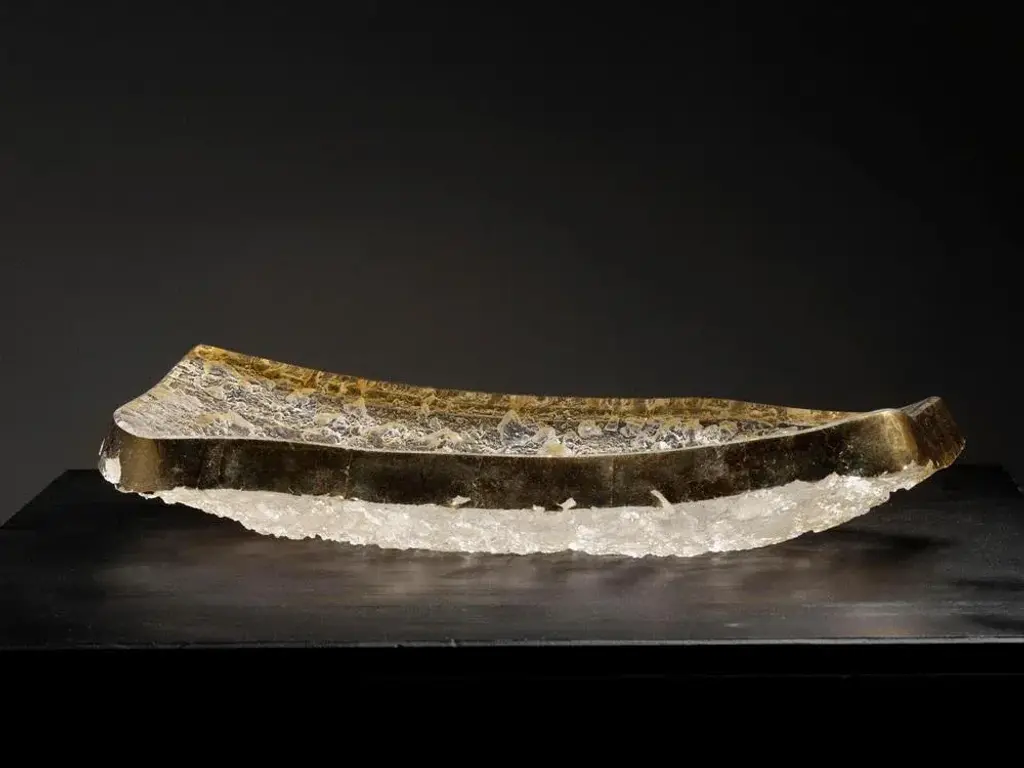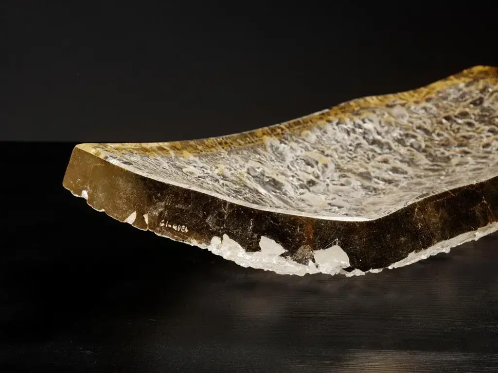 Géode rectangular plate by matthieu gicquel dimensions: d 21 x w 46 x h 3 cm. Materials: optical glass and gold leaf. Weight: 7 kg. Each piece is numbered. praise for the moment light shines through the glass. Details are revealed one by one: here a light bubble rises, there a changing reflection. to seek to understand matthieu gicquel’s glass art - because what we’re really talking about here is touching the senses of the material, of the work - is first and foremost to follow the path mapped out by junichiro tanizaki in in praise of shadows. For him, «[\.] we forget what is invisible to us, we regard as non-existent what cannot be seen»; yet the creator’s entire will lies in this need to reveal to us what seems absent, to give substance to the mystery from a material so common that we no longer pay attention to it. Two words-concepts of japanese origin-form the original basis of matthieu gicquel’s artistic philosophy: wabi-sabi and yûgen. The first is the powerful idea that beauty is to be found in the banal, the everyday, the vile. To the european eye, at first glance, it seems hard to grasp: what beauty is there in a chipped bowl, in pronounced wear and tear? but then\. The everyday and the commonplace contain within them the sublime. But the evidence of beauty, its subtlety, is intrinsic to the object and above all to the way it is viewed. That’s the whole idea behind yûgen: each object is a universe in itself, but it’s up to the viewer to let themselves be caught up in its mystery. At the crossroads of these two concepts, we are talking here about a meditative state, taking time, slowing down. sitting down, contemplating one of matthieu gicquel’s creations, letting yourself be carried away by a colour changing with the light, by a reflection, a ray. A glass object is a moment when the mind wanders, discovering details and minute variations. A creation is a ray of sunlight on the skin when you wake up in the morning. The work of the glassmaker is extreme formal simplicity combined with the complexity of the soul and the eye.
