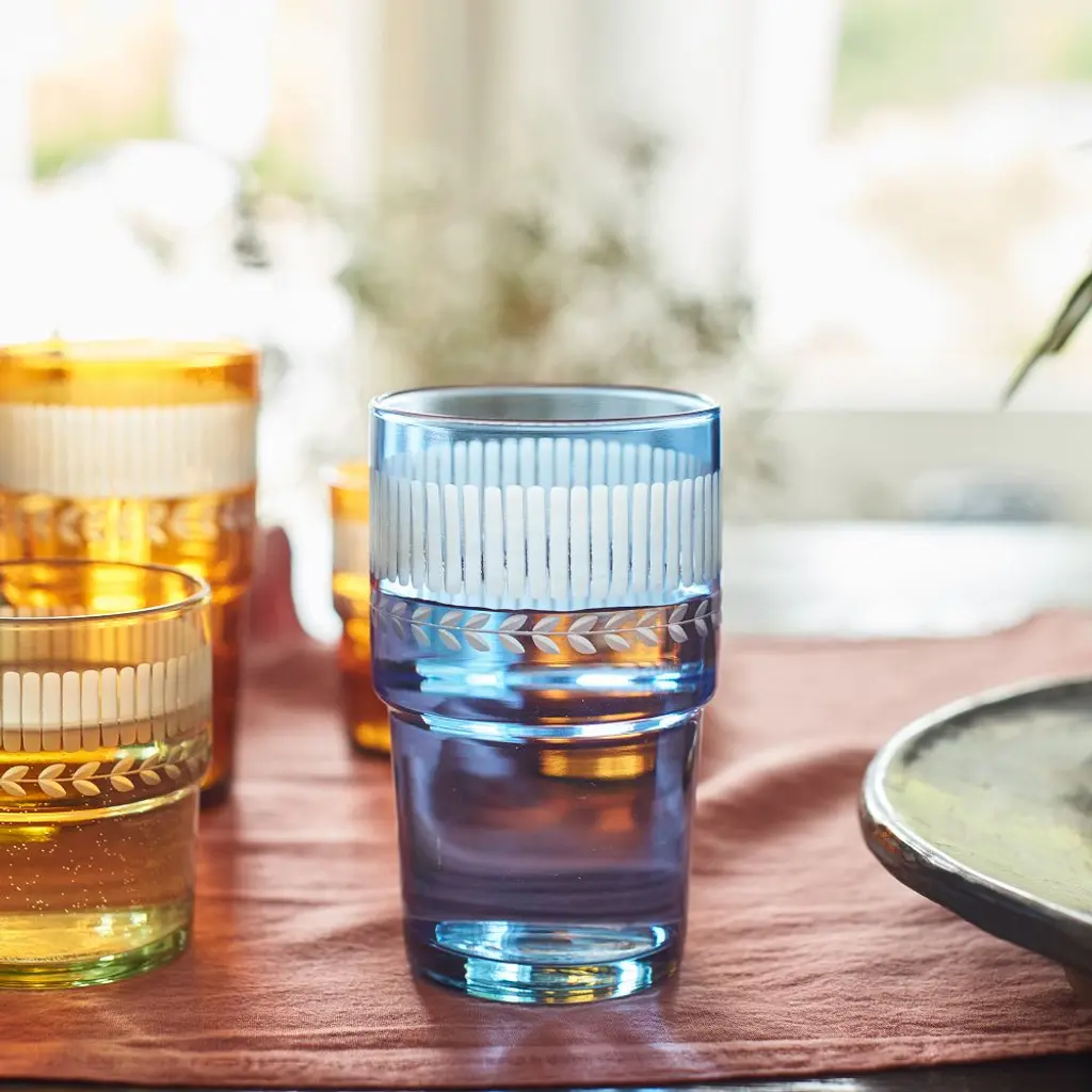 Jewelry for the table. In a spectrum of rich shades, this drinkware is made from recycled soda glass hand-cut with a delicate pattern. Dishwasher-safe, stackable, and designed for everyday use.