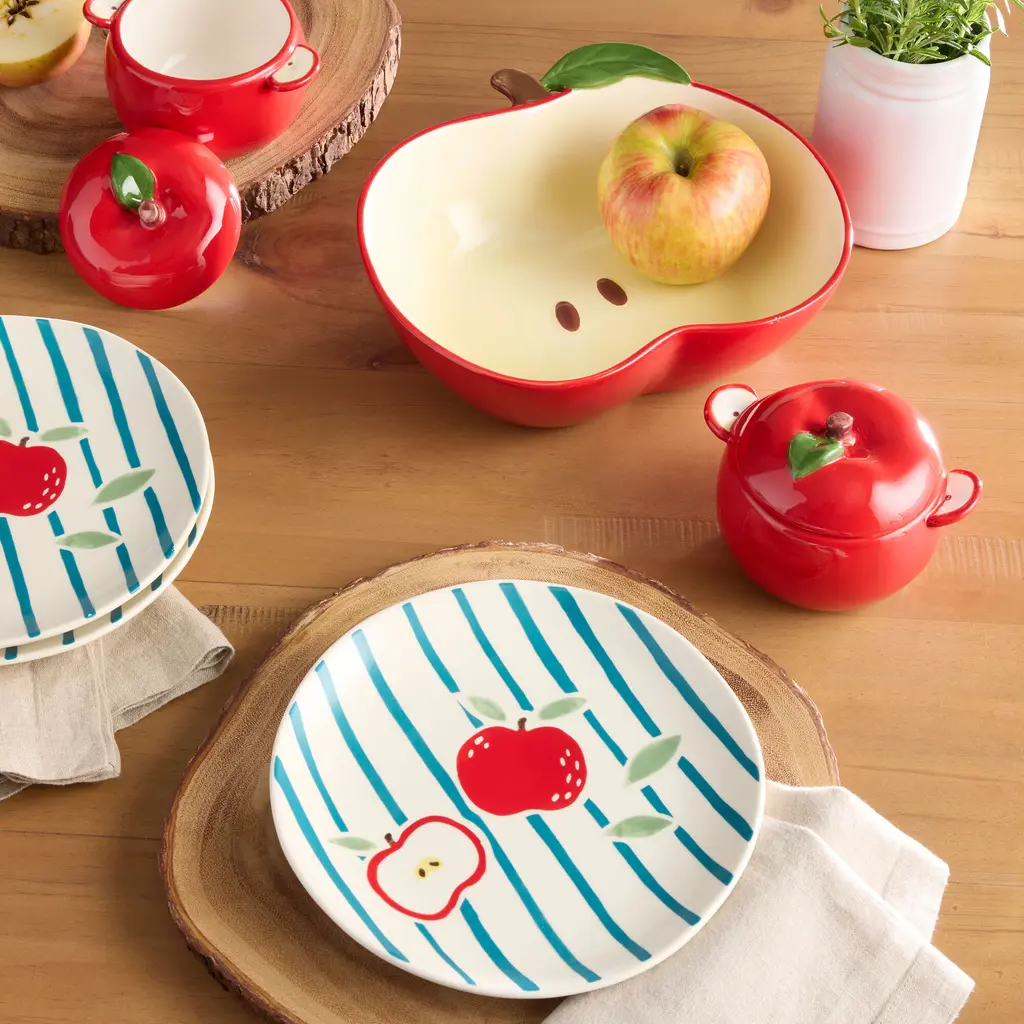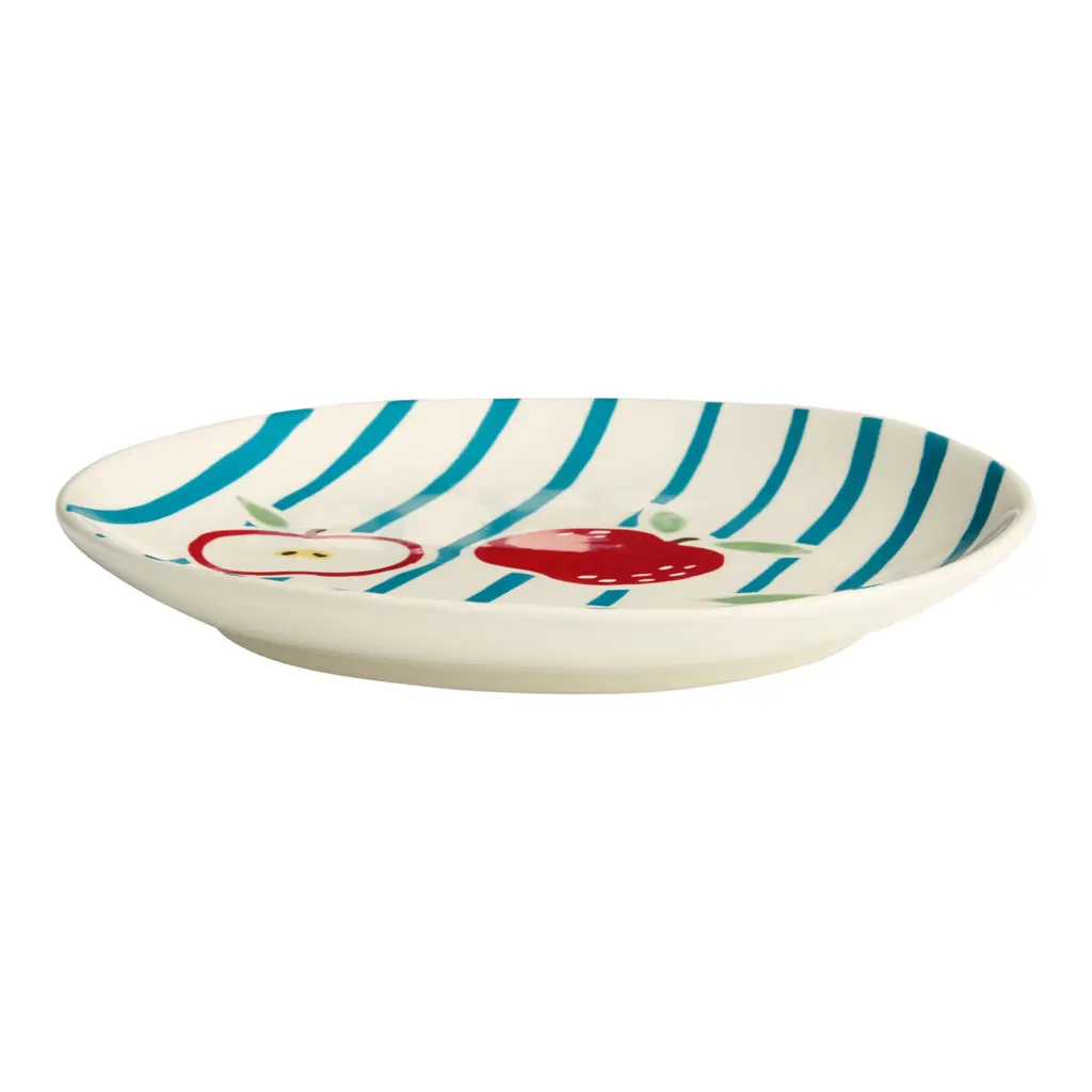 Bring the cheer of a sun-drenched apple orchard to your dining table with our appetizer plate, hand painted with a striped ground and apple artwork. Made of stoneware with a subtle organic rim and off-white, blue, green, and red palette, this colorful plate is full of cute character. Perfect for serving a side of fruit salad or a slice of apple pie, it refreshes your table - no trip to the farmers market required.