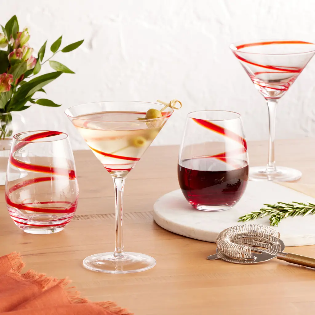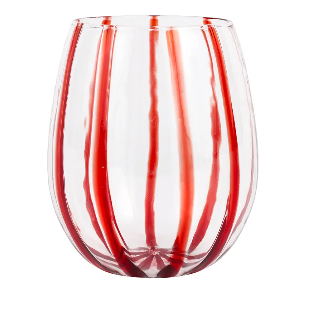 Make your spirits bright all holiday season with this handmade stemless wine glass. With subtle, natural variations on each piece, this special bar glass stands out with a festive red swirl detail. Pair with any of our red varietals and gift to any wine afficionado or Christmas hostess, or use this modern, display-worthy glassware yourself.