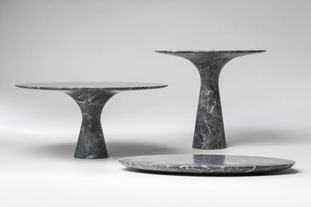 Refined Contemporary Marble 01 grey Saint Laurent marble platterSigned by Leo Aerts.Dimensions: Diameter 32 x Height 2 cm Material: Grey Saint Laurent Marble.Technique: Polished, Carved. Available in Marble: Kyknos, Bianco Statuarietto, Grey Saint Laurent, Picasso Green, Port Saint Laurent, Travertino Silver, Rosso Lepanto, or Travertino Rosso. Available in sizes Medium or Large. Also available in Sets. Angelo O is the brother and scale model of the natural stone table Angelo M. Angelo O can be ideally used as a cake dish or to serve other delicacies. The collection consists of three different models available in nine different marble types. Each object is completely hand-finished and is signed on the bottom. The slim base provides an elegant look and also promotes holding the object while serving.The objects have a honed, matte finish. Every Angelo O cake dish is packed in an original wooden gift box.A sculptural shape, robust material, elegant design, and a refined finish are the characteristics of Angelo O. The essence of each piece is defined by design, natural stone, and craftsmanship to meet the highest quality requirements. Angelo O2 is the little brother and scale model of the internationally award-winning Angelo M round table.Interior architect and designer Leo Aerts has run his own design agency Alinea for more than 30 years. The design has become part of his lifestyle. He swears by sober functional and timeless design that can be passed on from generation to generation. Neither Leo nor his designs can be categorized easily. The leitmotif? Durable materials are full of character. According to Leo, quality should always take precedence over quantity. His designs have repeatedly received national and international awards and accolades, including the coveted German Red Dot Award as well as the German Design Award, the Good Design Award in Chicago, and the AZ Award in Toronto.
