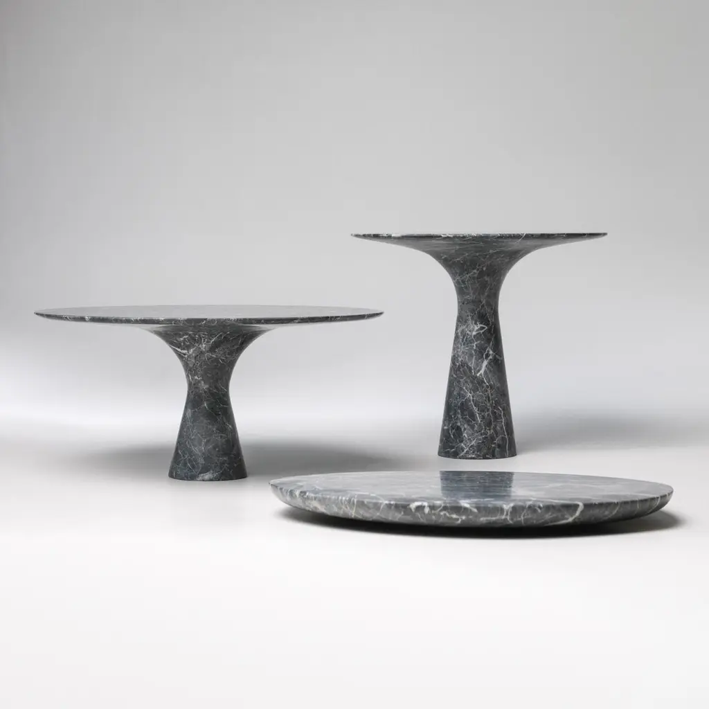 Refined Contemporary marble 02 grey saint laurent marble cake standSigned by Leo Aerts.Dimensions: diameter 32 x height 15 cm Material: grafite marbleTechnique: polished, carved. Available in Marble: Kyknos, Bianco Statuarietto, Grey Saint Laurent, Picasso Green, Port Saint Laurent, Travertino Silver, Rosso Lepanto, or Travertino Rosso. Available in sizes Small or Large. Also available in Sets. Please contact us for more information. Angelo O is the brother and scale model of the natural stone table Angelo M. Angelo O can be ideally used as a cake dish or to serve other delicacies. The collection consists of three different models available in nine different marble types. Each object is completely hand-finished and is signed on the bottom. The slim base provides an elegant look and also promotes holding the object while serving.The objects have a honed, matte finish. Every Angelo O cake dish is packed in an original wooden gift box.A sculptural shape, robust material, elegant design, and a refined finish are the characteristics of Angelo O. The essence of each piece is defined by design, natural stone, and craftsmanship to meet the highest quality requirements. Angelo O2 is the little brother and scale model of the internationally award-winning Angelo M round table.Interior architect and designer Leo Aerts has run his own design agency Alinea for more than 30 years. The design has become part of his lifestyle. He swears by sober functional and timeless design that can be passed on from generation to generation. Neither Leo nor his designs can be categorized easily. The leitmotif? Durable materials are full of character. According to Leo, quality should always take precedence over quantity. His designs have repeatedly received national and international awards and accolades, including the coveted German Red Dot Award as well as the German Design Award, the Good Design Award in Chicago, and the AZ Award in Toronto.