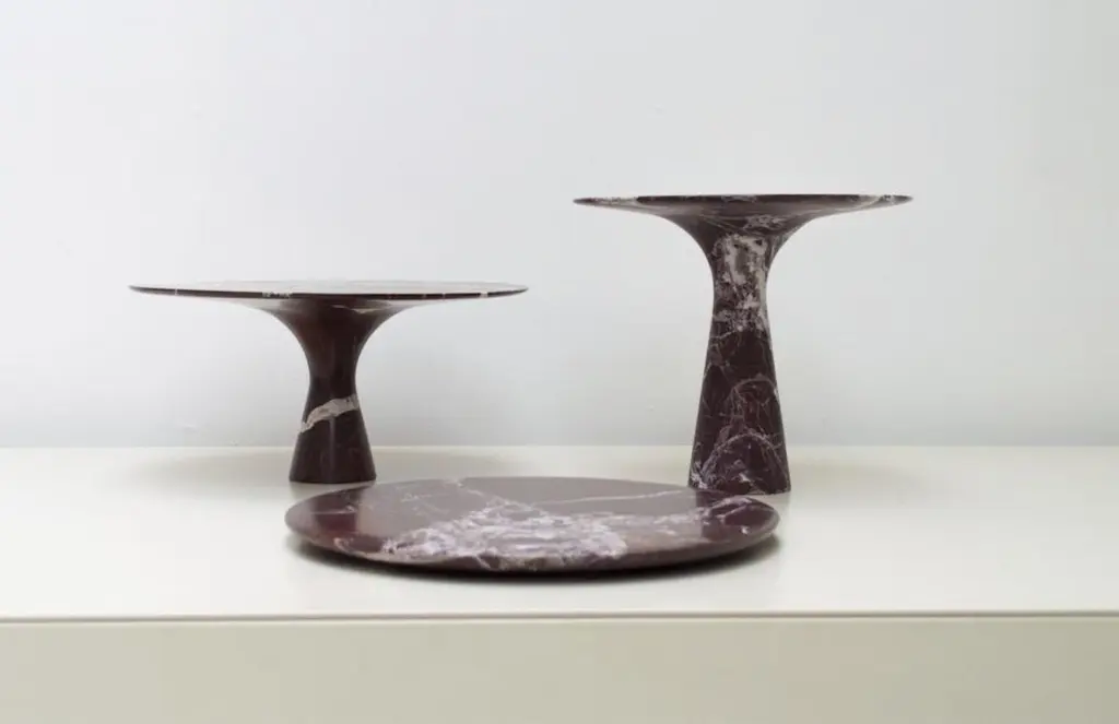 Refined Contemporary marble serving plate.Dimensions: ø 32 x 15 cm HAngelo O is the little brother and scale model of the natural stone table Angelo M. Angelo O can ideally be used as a cake plate, cheese platter or to serve other delicacies. The bottom is one running curve from foot to edge, making this cake plate one beautiful whole. The base provides an elegant look and also facilitates the holding of the object while serving. To show the marble in it’s most expressive character, different finishes are possible (polished, honed, brushed, striped, sandblasted & brushed). The basic collection consists of nine different types of marble and different sizes.The design Angelo is the essence of a round or oval table in natural stone, it features a sculptural form, sturdy material, an elegant line and a refined finish. Two elements, table base and top, form one whole together. The bottom is one running curve from table foot to edge. The conical connection creates a stable whole.To show the marble in it’s most expressive character, different finishes are possible (polished, honed, brushed, striped, sandblasted & brushed). The basic collection consists of nine different types of marble and different sizes. On request this design can be executed in almost any type of marble and on measure. This table is perfectly suitable in a housing, retail or office environment. As the table is supported by one central foot it creates a lot of flexibility in seating. Executed in hard variations of natural stone suited for external use, this design can be a perfect garden table or sculpture.Angelo M/R 130 : ø 130 x 75 cmAngelo M/R 160 : ø 160 x 75 cmAngelo M/R 180 : ø 180 x 75 cmAngelo M/O 210 : 210 x 135 x 75 cmAngelo M/O 250 : 250 x 160 x 75 cmAngelo M/O 290 : 290 x 160 x 75 cm The basic collection is available in the following marbles: Kyknos, Grafite, Travertino Rosso, Grey Saint Laurent, Picasso Green, Port Saint Laurent, Travertino Silver, Rosso Lepanto and Bianco Statuarietto in a honed finish. On request different sizes, finishes and marbles are possible. AwardsGood Design Award – Chicago, USA (2018)People’s Choice, AZ Award – Toronto, Canada (2019)German Design Award – Frankfurt, Germany (2020).