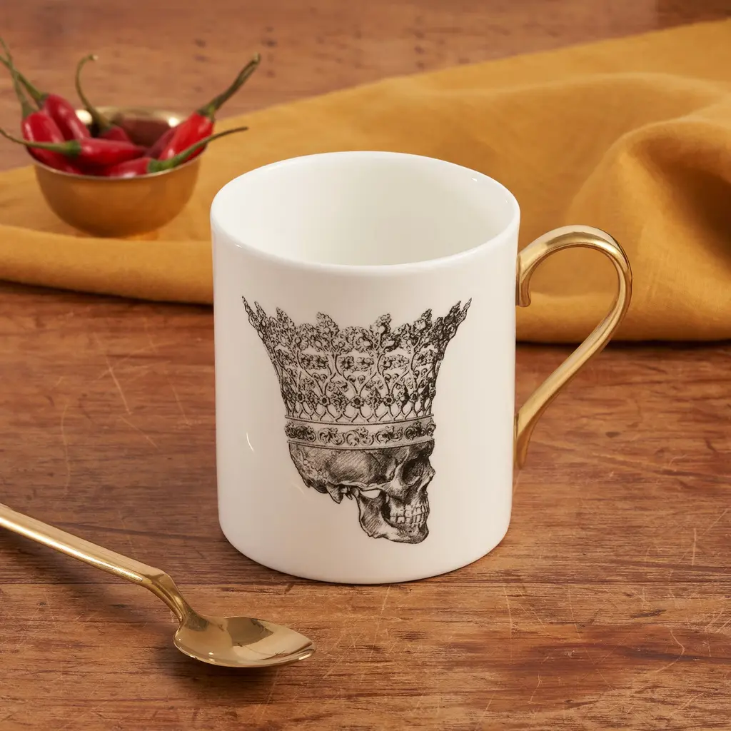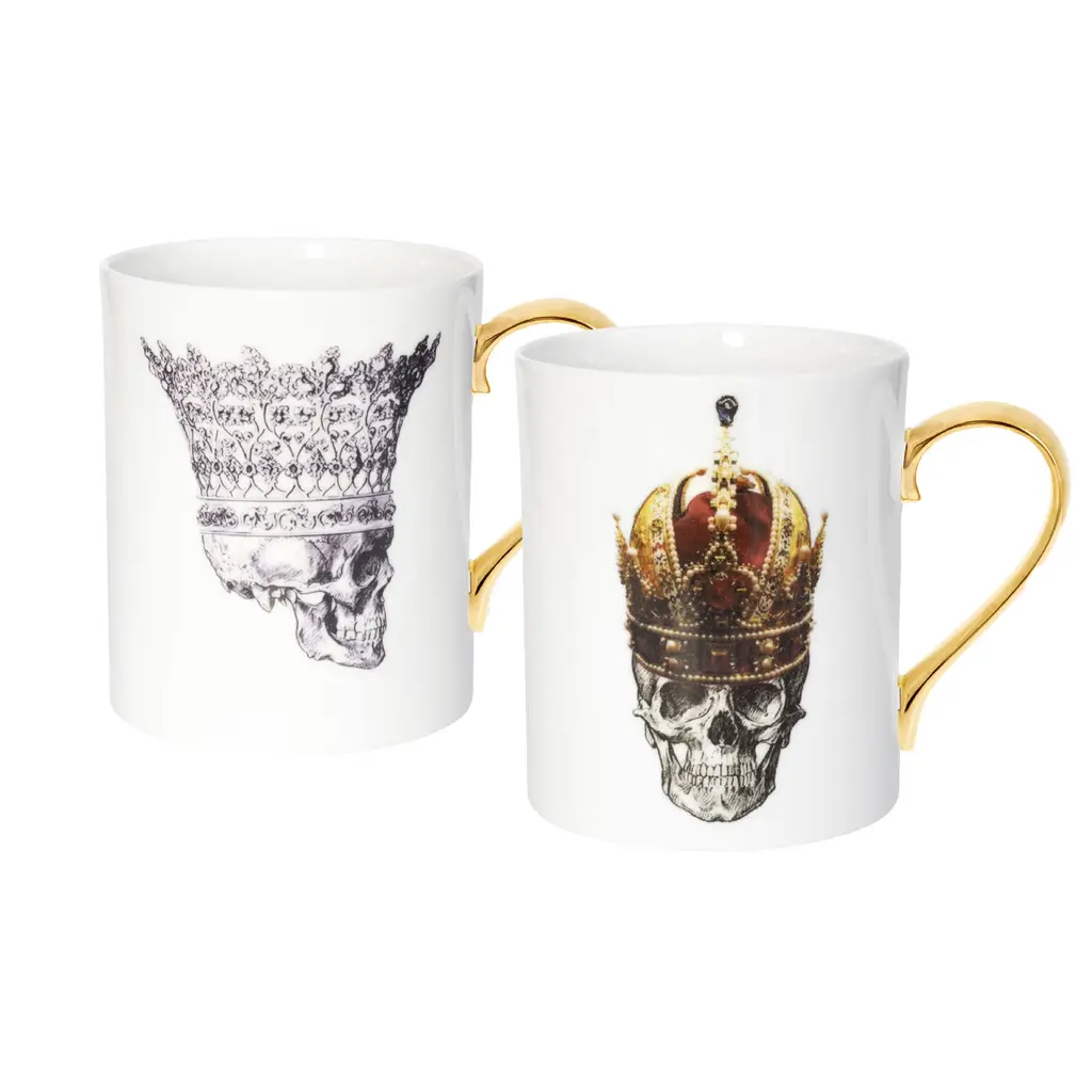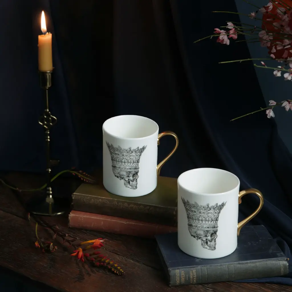 A set of two exquisitely handcrafted fine bone china mugs featuring the London Inspired Skull in Crown design from the Melody Rose Rock and Roll Collection.The playful designs paired with the best of British craftsmanship make a wonderful gift for coffee and tea lovers.Features hand painted 22kt burnished gold gilded handle for both a luxurious and dishwasher friendly finish.Perfect on their own, or mix and match pieces from the Melody Rose fine bone china range to create a unique heritage set with a 21st century twist.