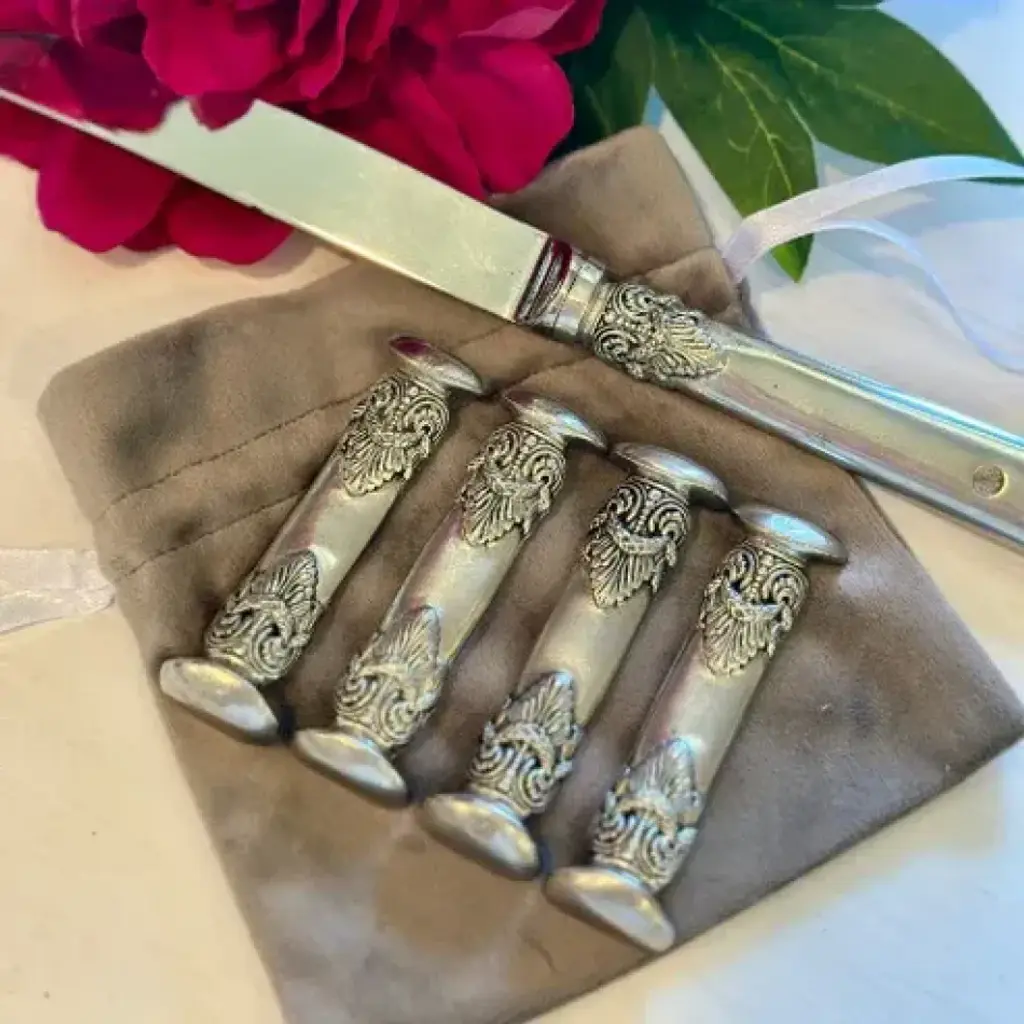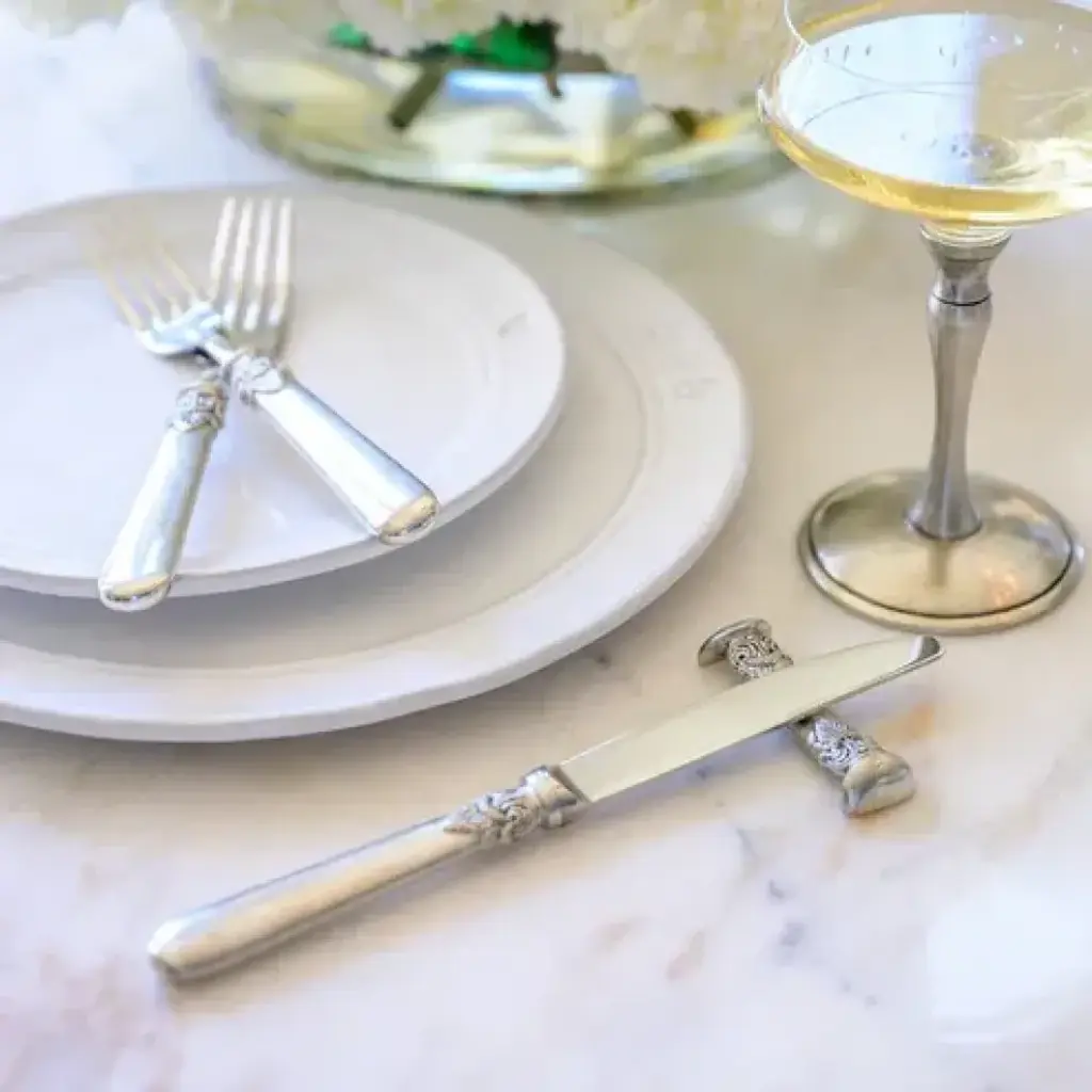 Add an elegant touch to your table setting with this set of four pewter knife rests featuring the distinctive Regale pattern. They complement our Regale flatware collection as well as the charcuterie serving fork and spoon. Designed to keep used knives off the table, preventing messy drips on your linens and surfaces, they add a touch of sophistication to any meal. Founded in 1997 by Ann Skidmore, Arte Italica is a story of one woman's passion for Italian history, culture, art, and vintage pewter. Today, Arte Italica is one of the leading importers of European tabletop and home accessories products in the United States. Every piece is handmade and designed so that they can easily be mixed and matched to create a timeless, classic, and effortless look.