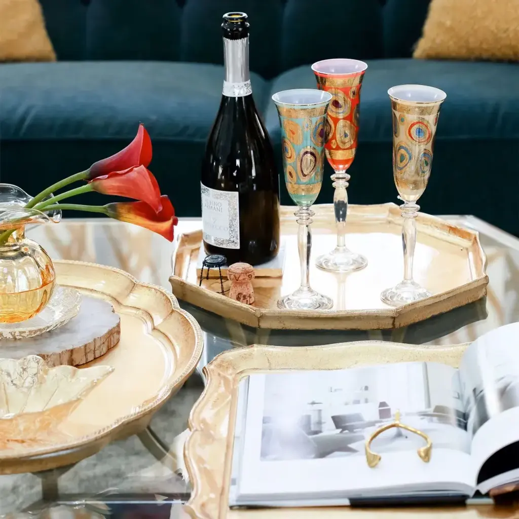 Ornate emblems and decorations that are indicative of royalty inspired this unique drinkware collection. The Regalia Champagne Glass is handpainted in 14-karat gold. Since 1983, Vietri has specialized exclusively in Italian handcrafted ceramics, stainless and pewter flatware, mouth blown glassware, lamps, urns and planters. Families of artisans with 3 or 4 generations of history create these special pieces using centuries-old techniques. The subtle color from a paintbrush and the curving stroke of the artist's hand are never repeated in quite the same way, making each piece truly unique.