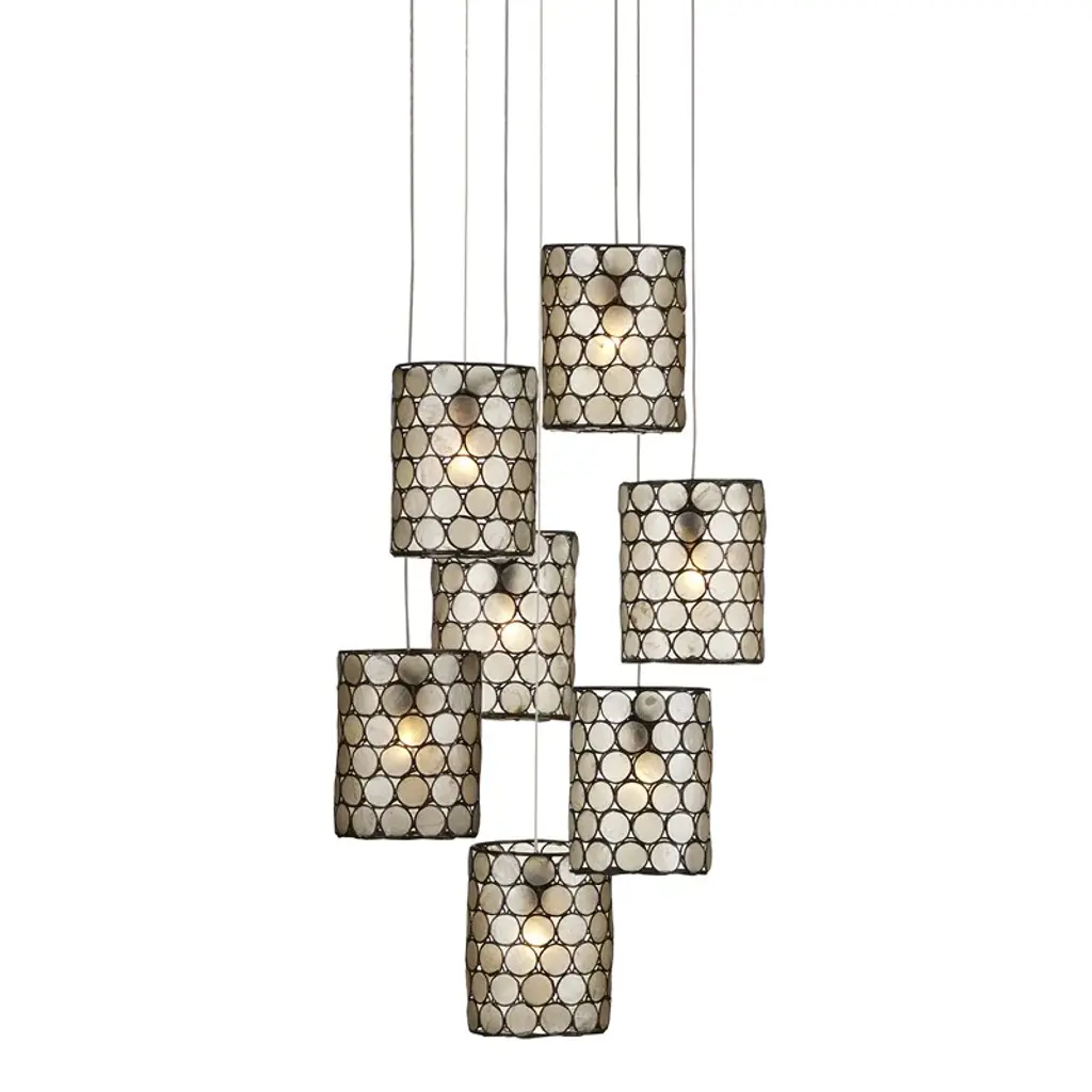 Natural Capiz shell and wrought iron in a Cupertino finish create a luminous circular pattern on the shades of the Regatta Round 15-Light Multi-Drop Pendant. Each cylindrical element has such a pleasing glow when light shines through the lustrous natural material. There is great artistry in achieving such a complex pattern, as each slice of shell has to be surrounded in metal and soldered into a frame once the metal circles are joined to each other. The canopies of the shell pendants in this collection are luminous in a painted silver finish.