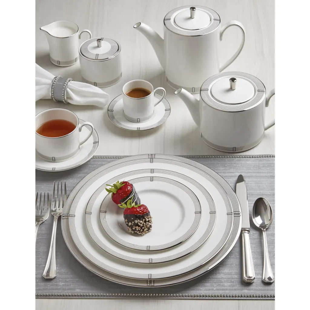 Regency sculpted china is a great accent for a truly special event. Gold or platinum edging calls to mind the inlaid metalwork of the Regency period. Nesting circles frame each piece in the spirit of early 20th Century design. Prouna Jewelry china makes a great wedding gift, and is sure to become a prized family heirloom. Prouna Jewelry marries the beauty of fine bone china dinnerware with the sparkle of Swarovski Crystal Elements. Sculptural white china serves as an elegant base to hand-painted designs, gold and platinum ornamentation and dazzling arrays of Swarovski crystals. With several patterns to choose from, each with its own unique story, you're sure to find one you love. The crystals are attached with a special method that is tested dishwasher safe. A true marriage of technology and style, Prouna Jewelry Dinnerware is the height of luxury.