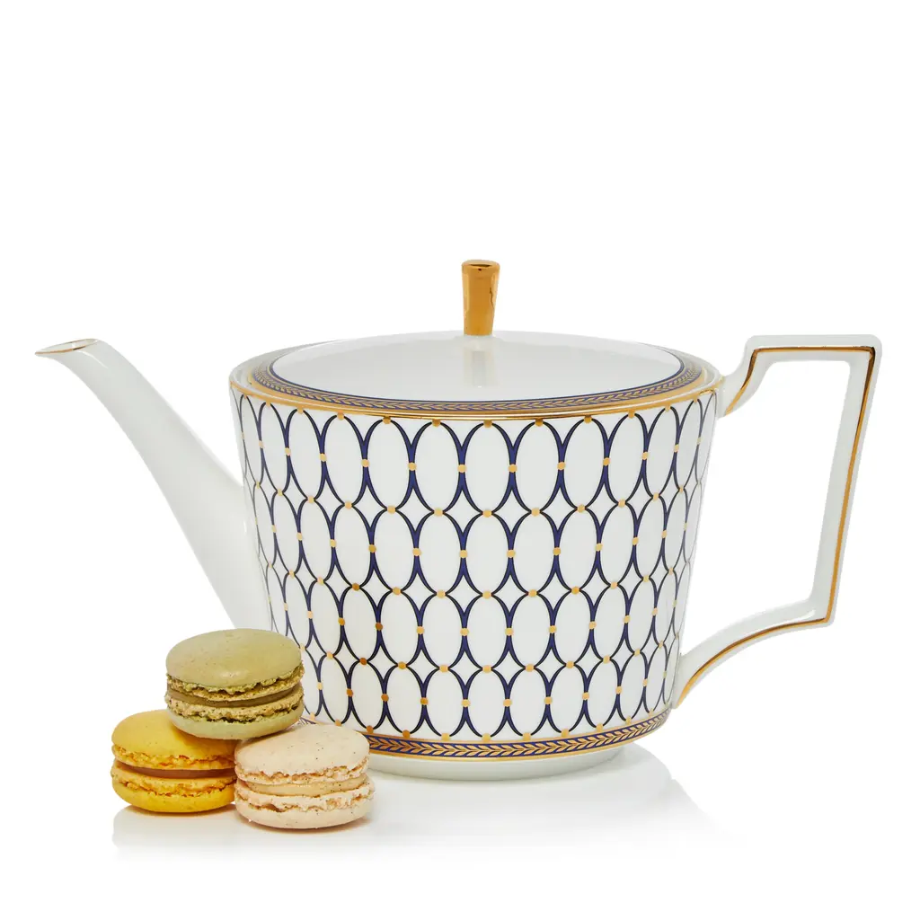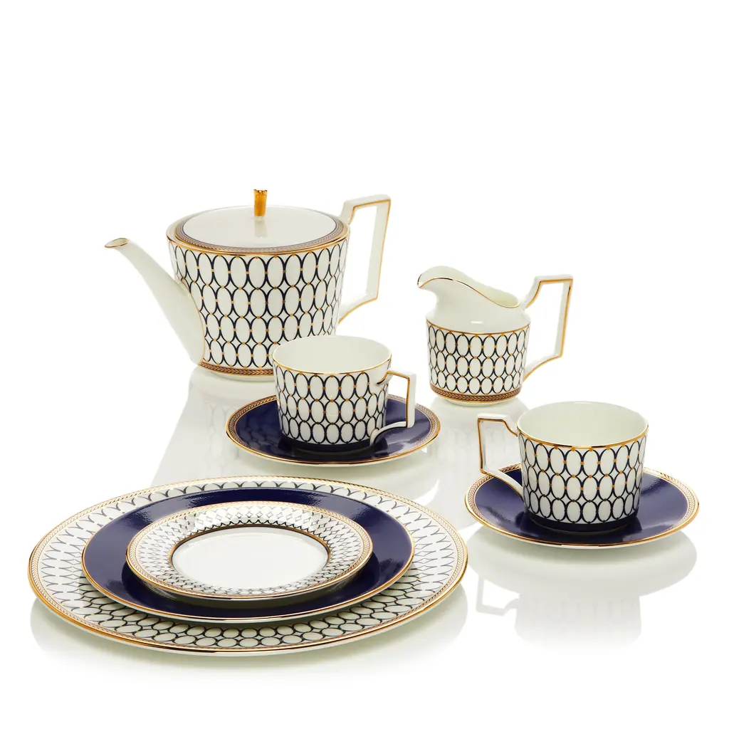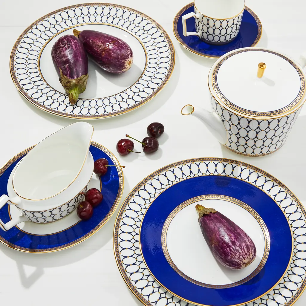 Embellished with intricate garlands, oval links and a fanciful dragon motif, this Wedgwood dinnerware evokes Europe's glorious Renaissance period. Rendered in deep blue and gold to transform any formal meal into a spectacular royal gala.