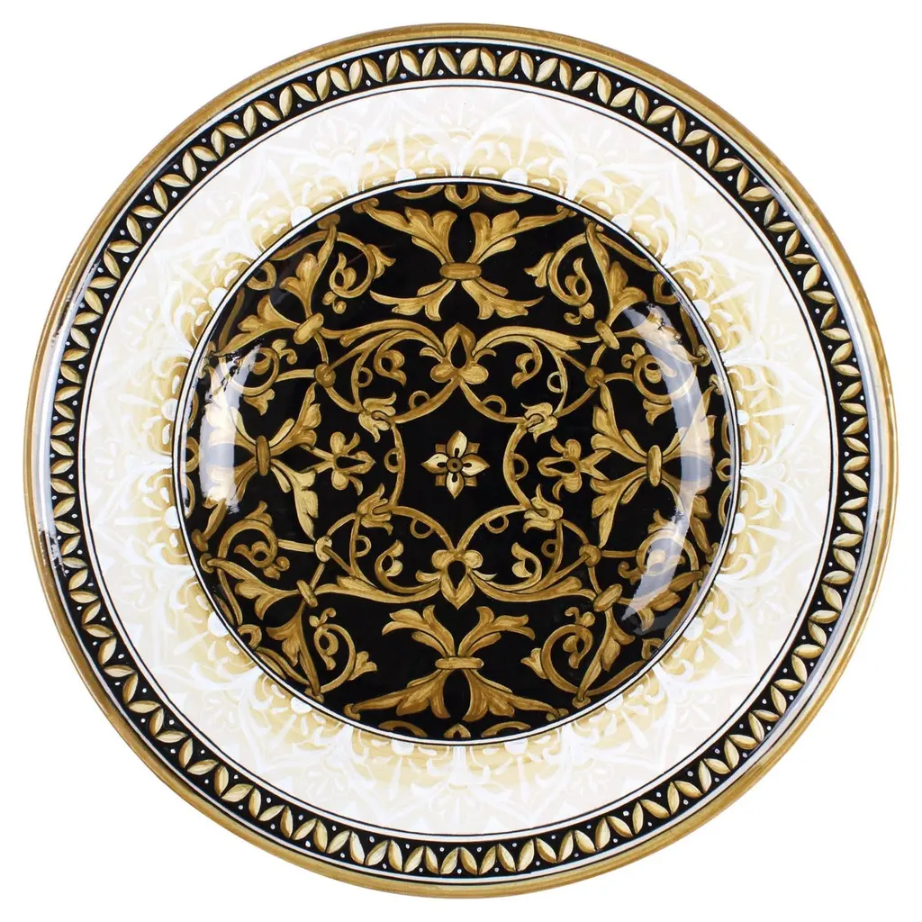 Interpreting a traditional Deruta ceramic pattern from the Renaissance with a modern color combination, Sambuco created this stunning decorative plate to showcase on a wall, display cabinet, or as striking centerpiece. Entirely decorated by hand in vibrant yellow over a striking background, this elegant piece can be combined with the other pieces in the same palette for a unique decoration in both classic and contemporary interiors.