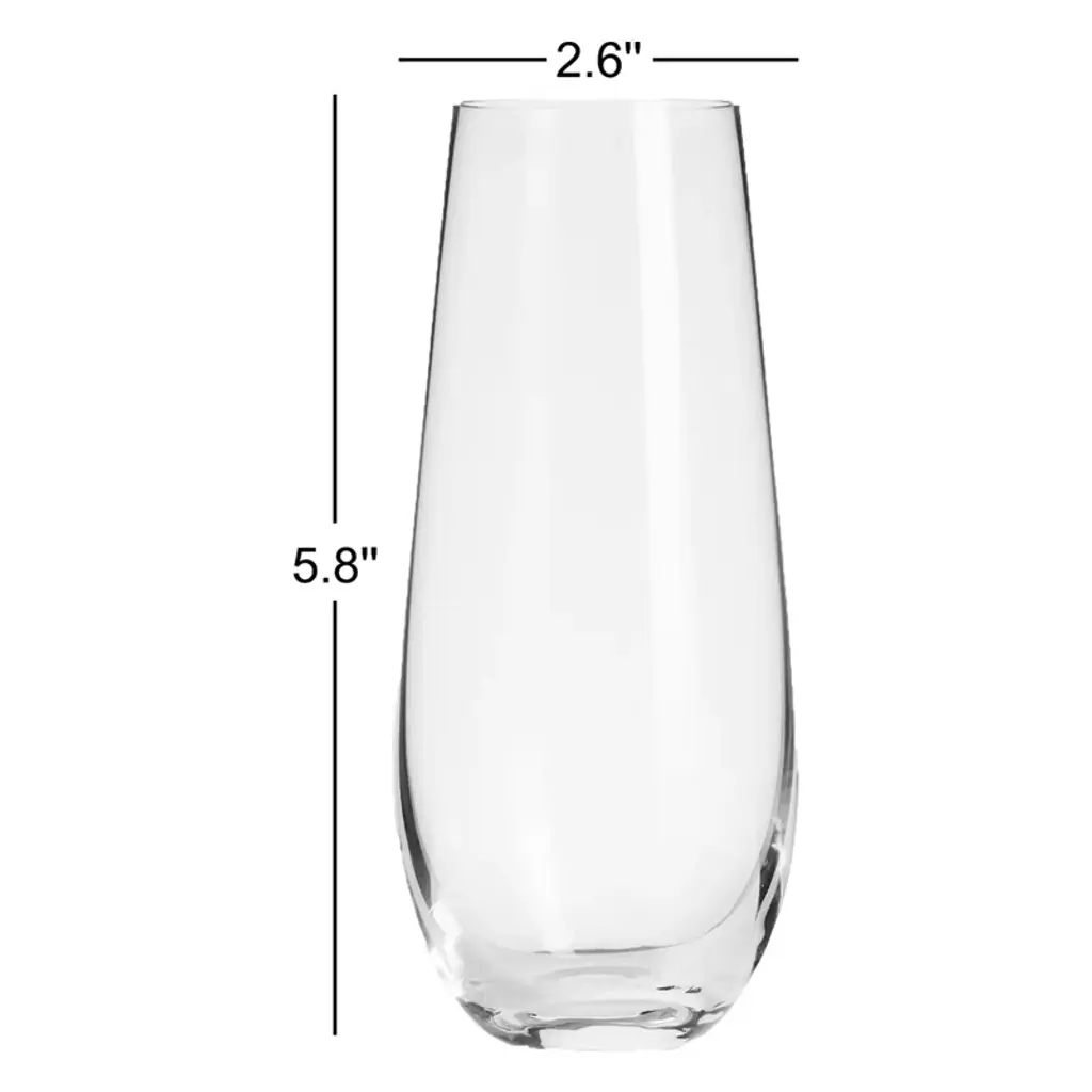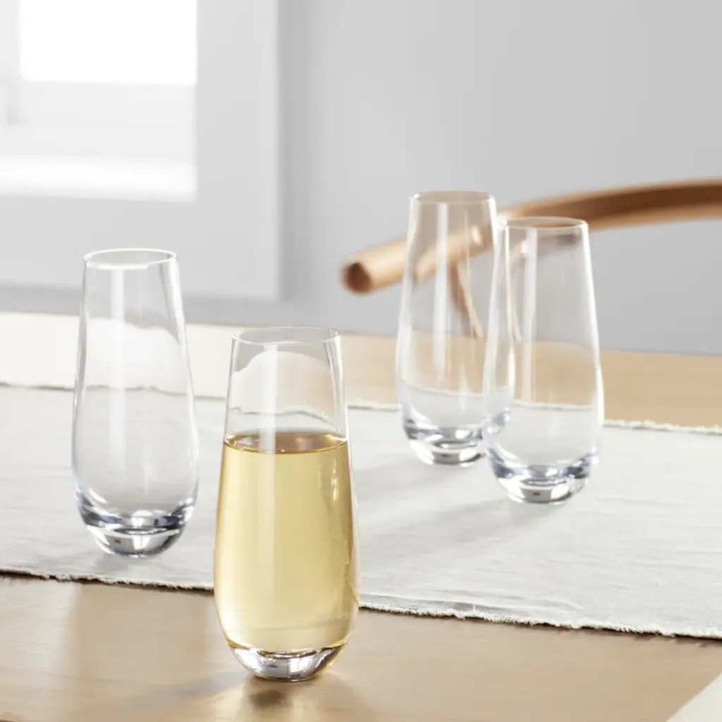 This 4-piece set of champagne flutes features a contemporary stemless design that complements your barware and helps you serve brunch and toast to various special occasions. Each glass holds 10 oz. and is crafted from hand-cut lead-free crystal with a slender, understated design for a hint of refined style. One of our favorite perks? This collection of flutes is hand-wash recommended. Plus, its slim shape makes it easy to tuck away in cabinets, in cupboards, and on bar shelves.