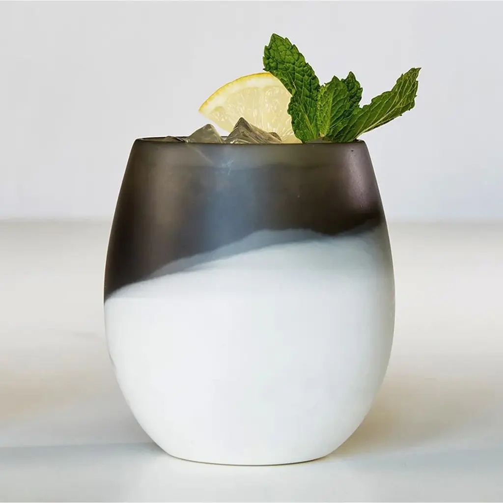 Toast to elegance with our gray + white stemless wine glass set! Made of durable resin, these glasses add a touch of sophistication to any occasion. Sip in style and elevate your drinkware collection with this set. Cheers!