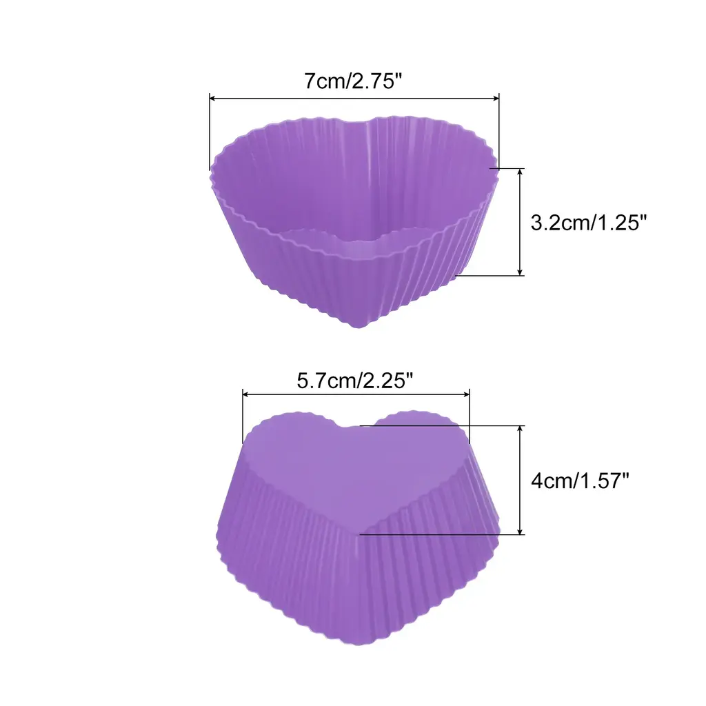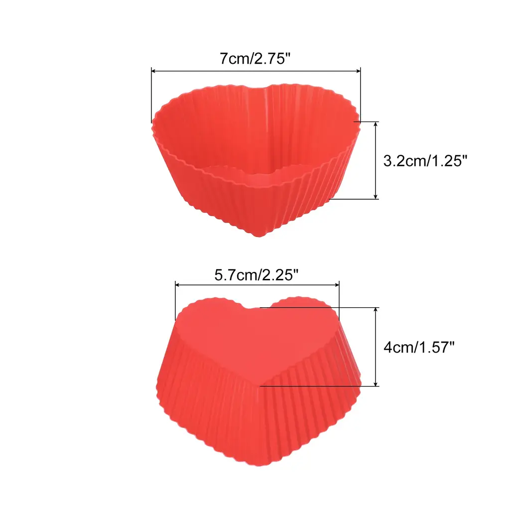 Advantage:Material - This baking cup is made of silicone material, sturdy and flexible, easy to remove, and non-stick, making your baking much easier.Heat Resistant - Withstand temperatures from 446°F (230°C) to-40°F (-40°C). Safe for use in the dishwasher, refrigerator, freezer, microwave, air fryer.Easy To Use - Spray with a little oil before using, then simply place the cupcake liner on a cookie sheet, fill and bake, and release donut easily.Easy To Clean - Just rinse silicone muffins cups with soapy water after each use, and then let them air dry. Also, you can put them in the dishwasher. No more scraping your treats out from the liner.Wide Application - Great for making tarts, baking muffins, and preparing frozen foods, cupcakes, pastry, desserts on baking sheets.Occasion - Widely applied for birthday parties, bachelorette parties, weddings, and other family gatherings to prepare tea desserts.Specification:Material: SiliconeColor: RedShape: HeartOpen Diameter: 7cm/2.75inch;Bottom Length: 4cm/1.57inch;Bottom Diameter: 5.7cm/2.25inch;Height: 3.2cm/1.25inch;Package Included: 18Pcs x silicone cupcake liners
