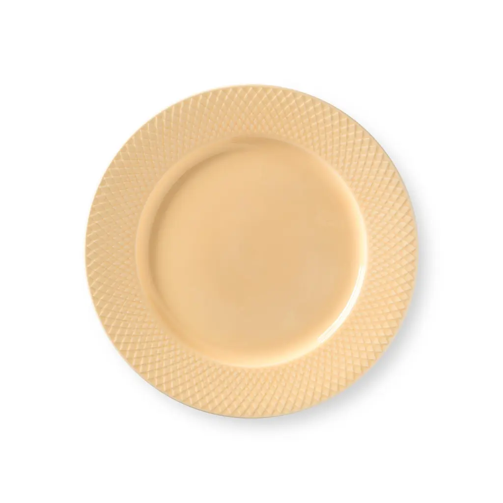 The Rhombe Color dinner plate keeps the archive rhombus relief on a wide rim and leaves the center clear for the food. Under the transparent glaze the geometry reads softly, framing whatever lands on it—from weekday pasta to a composed main. The low coupe profile stacks neatly and feels generous at 10.6″ Diam or 27 cm Diam. Developed with Copenhagen studio Stilleben, it’s made to mix: set a single shade with white Rhombe for a calm table, or alternate colors and let the motif hold it together. Glazed porcelain; dishwasher and microwave safe.