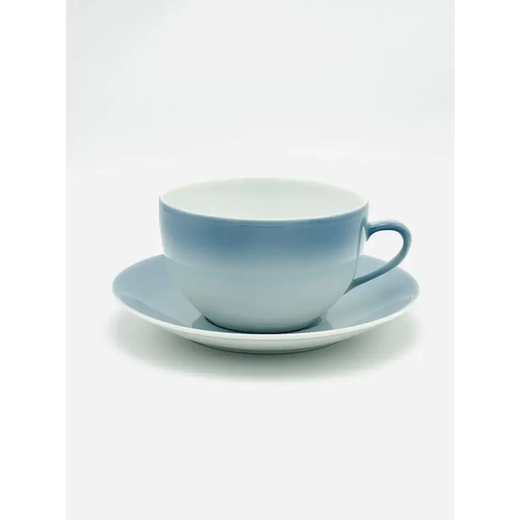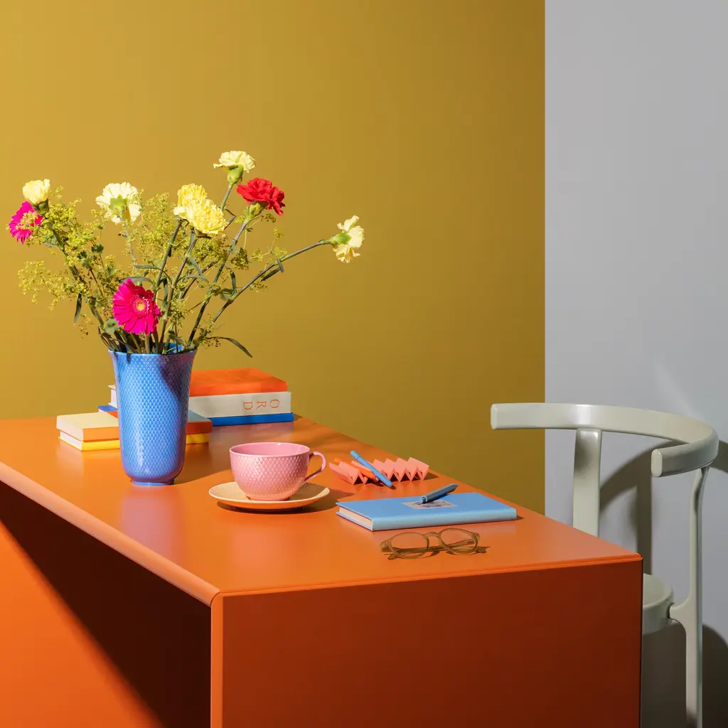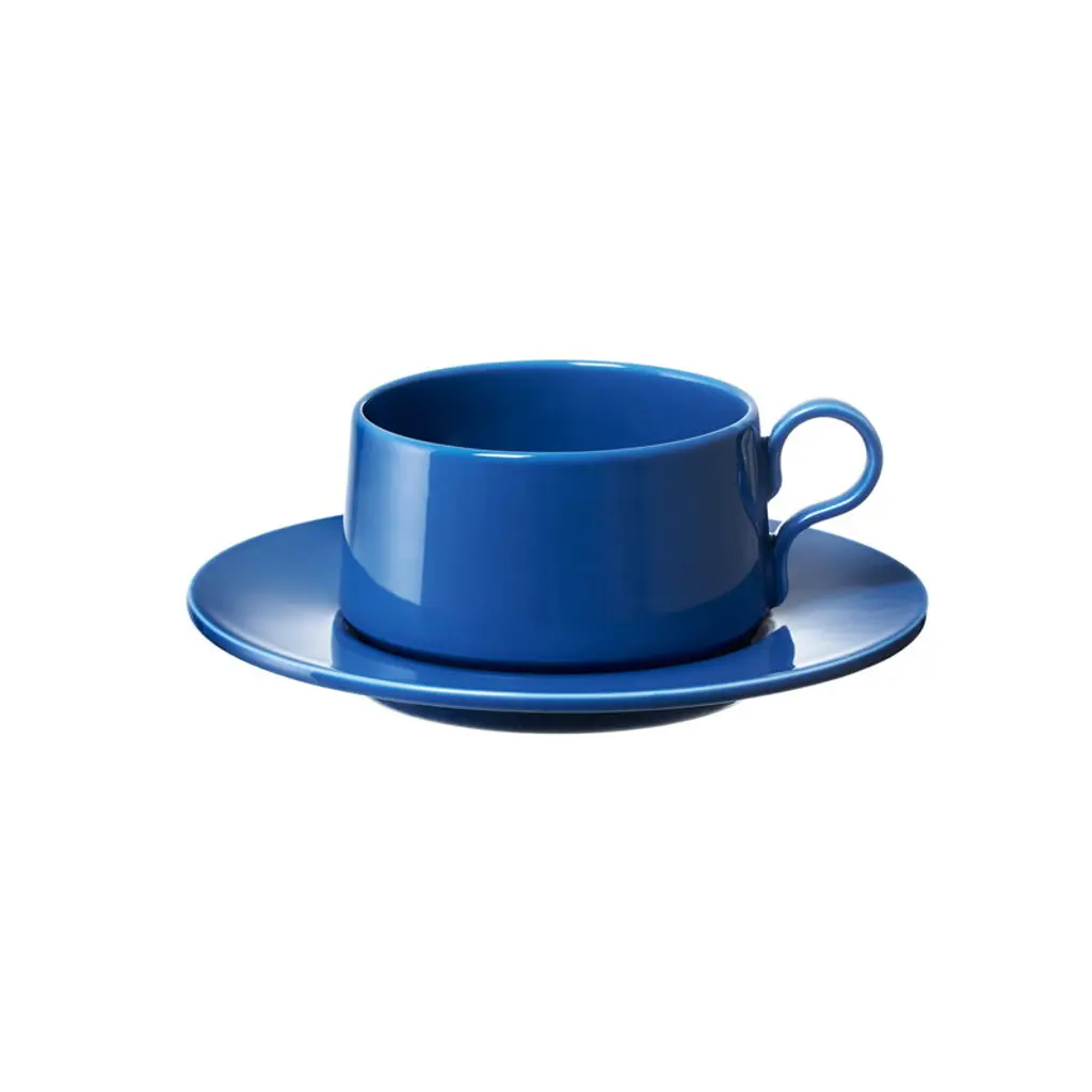 The Rhombe Color tea cup and saucer pair brings Lyngby Porcelæn’s archive relief to a small daily ritual. The cup’s rhombus texture gives a light grip while the lip stays thin for an easy sip; the handle sits high so fingers clear the body. The saucer mirrors the geometry with a shallow well that centers the cup and catches stray drips—also handy for a biscuit. Two ready-made duos keep the mix-and-match idea simple: Blue cup with Terracotta saucer or Rose cup with Sand saucer. Use them with white Rhombe for a calm table, or rotate colors across settings and let the pattern tie everything together. Glazed porcelain; dishwasher and microwave safe.