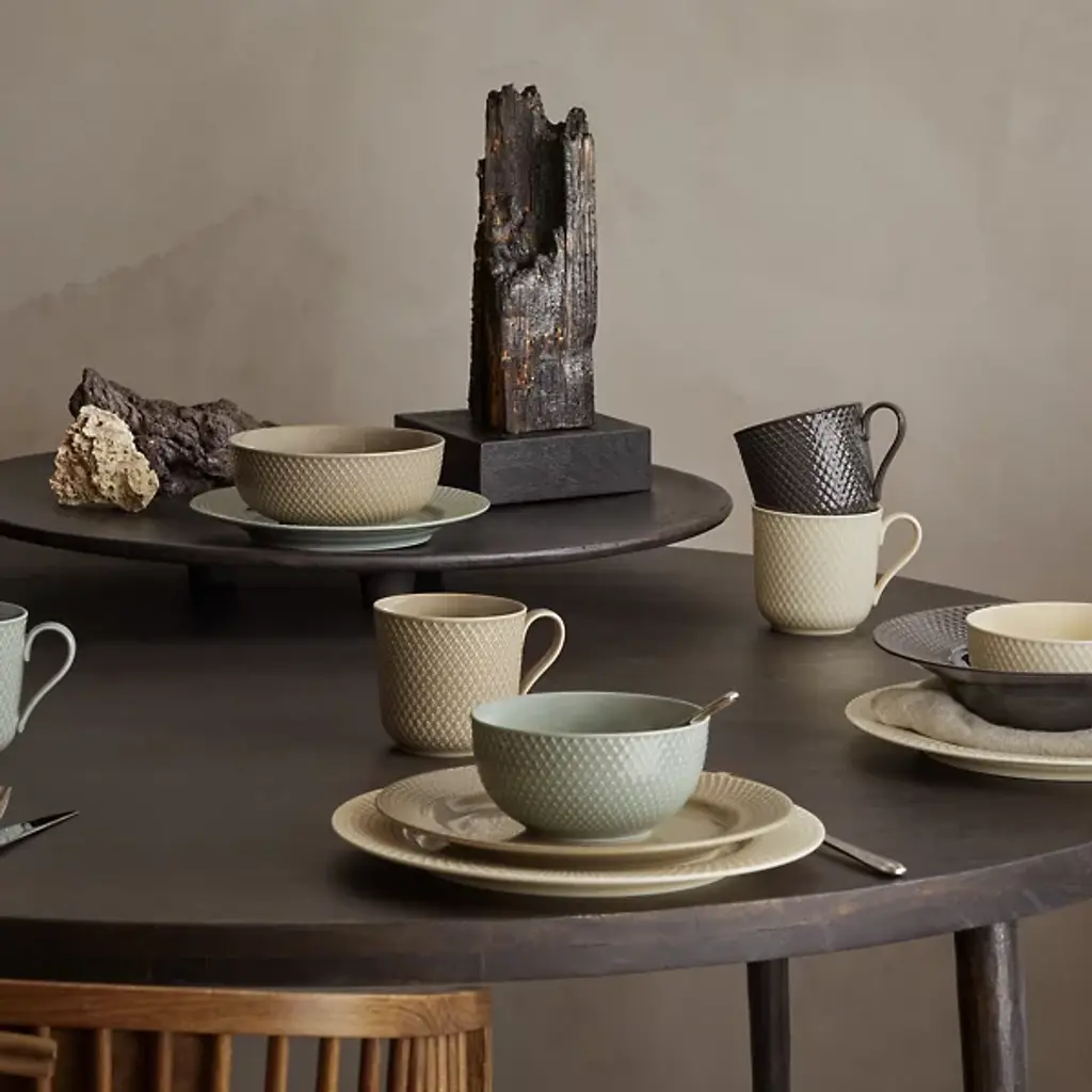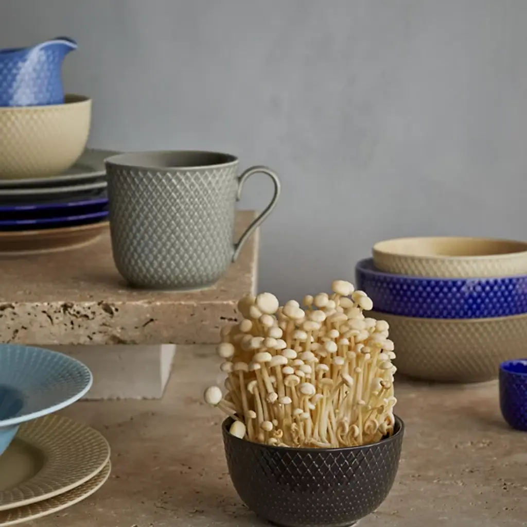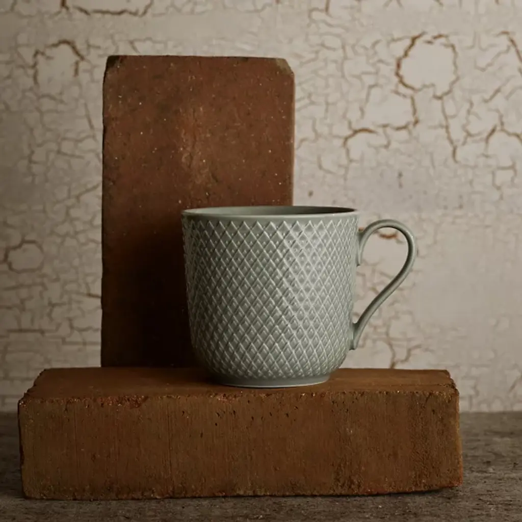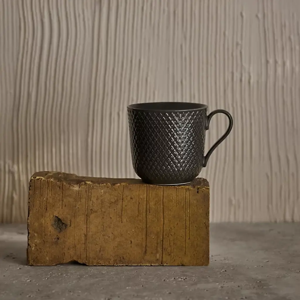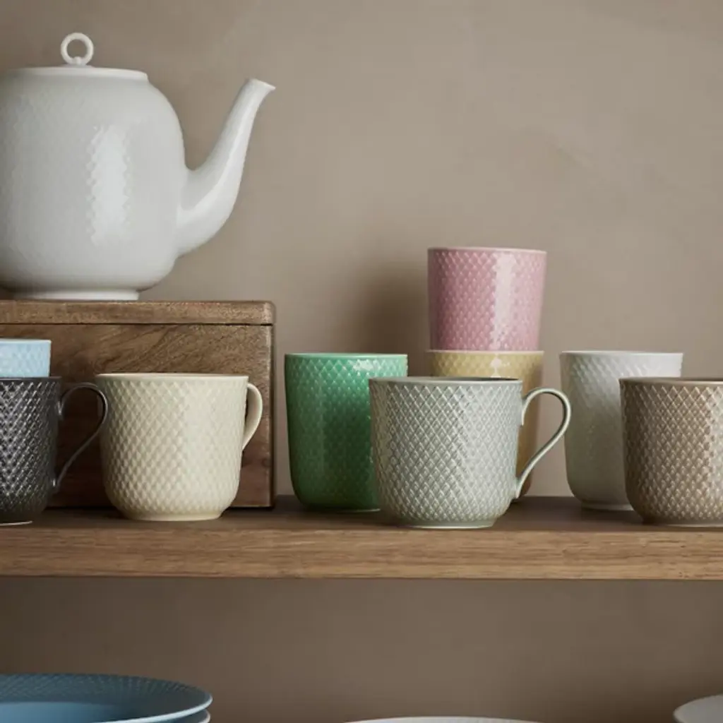 The Rhombe Earth Mug with Handle, Set of 4 from Lyngby Porcelaen presents a sleek, enduring example of Danish minimalism, defined by thoughtful exterior patterns. Ditte Reckweg and Jelena Schou Nordentoft of Stilleben designed each porcelain mug, featuring a slightly flaring rim and a slender handle that rests comfortably in the hand. Offered in natural hues that complement the classic white Rhombe collection, the mugs are dishwasher- and microwave-safe, uniting everyday function with refined design.
